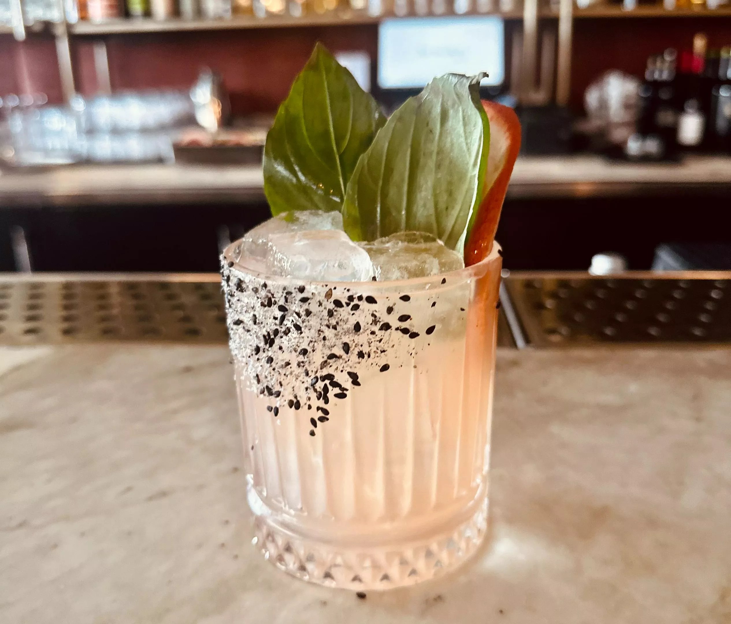 The leafy grapefruit garnish seemed to almost sprout from the ice cubes, and the herb and sesame rim looked like a chandelier cascading down the front of the glass. You smell the rim before you taste the drink itself, which consists of Casamigos Blanco, Casamigos Joven and pamplemousse; the smoky scent and fruity flavors mingle nicely.