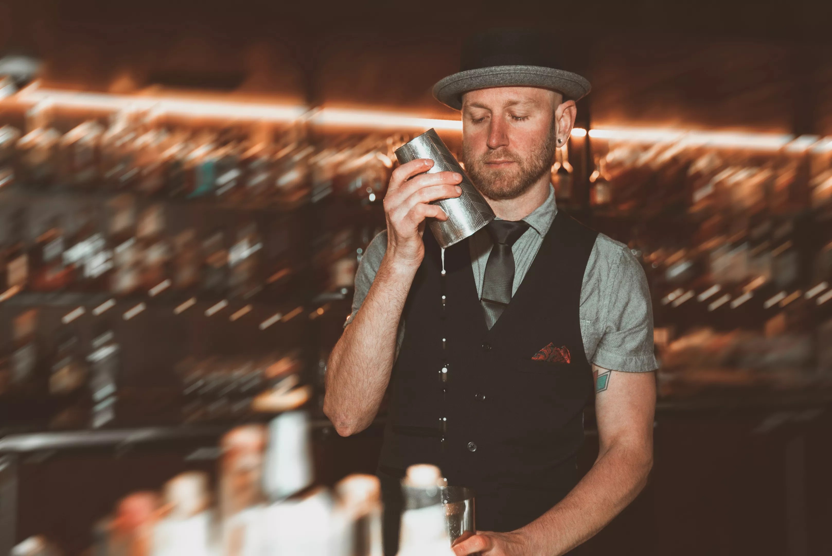 Bottles of shampoo and conditioner were replaced with bourbon, the lights dimmed, but the spirit of the ’50s remains, starting with the bars’ whisper of a grand entrance.