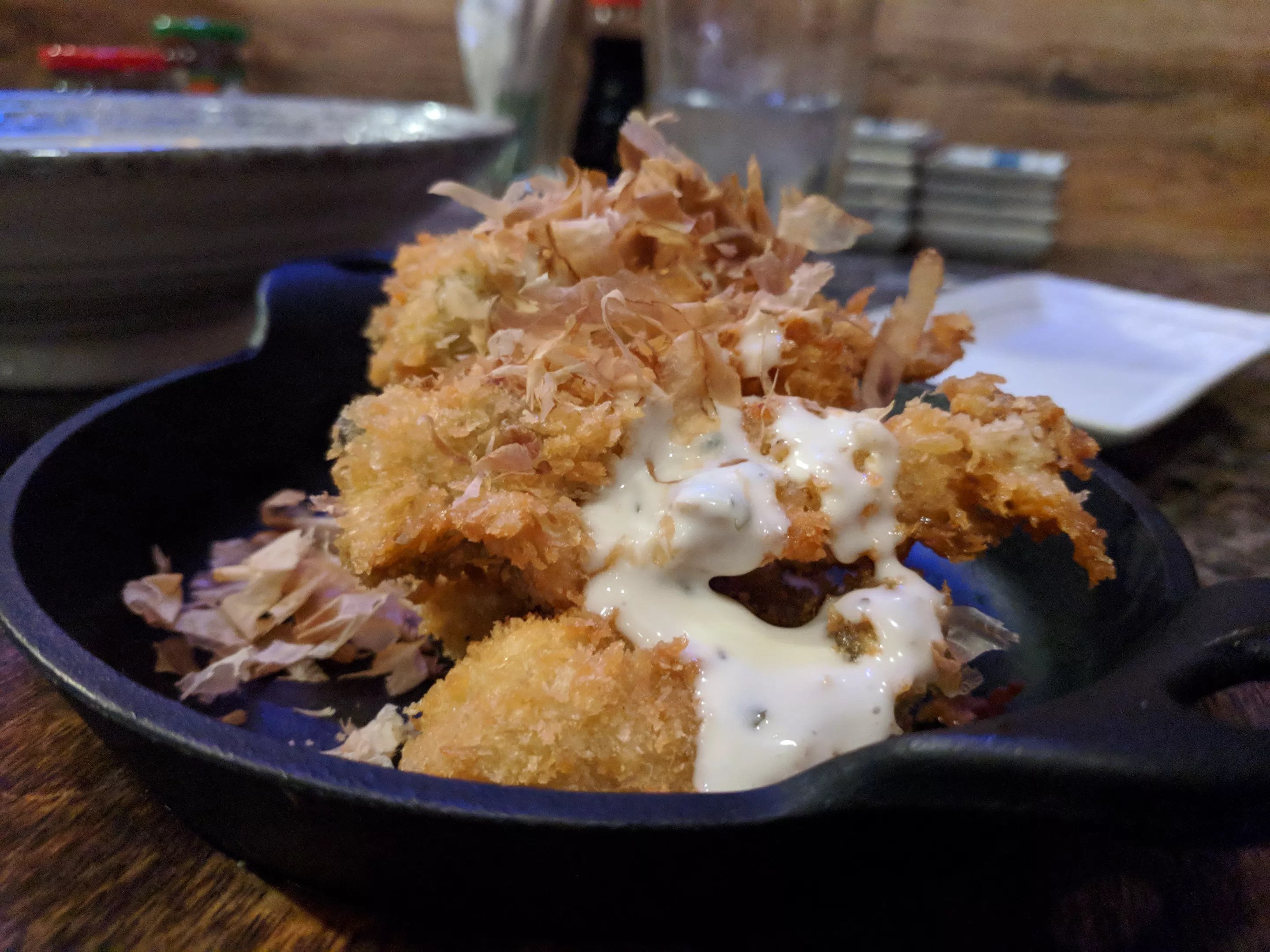 The result was a pretty darn good meal, nearly but not quite good enough to spare most Dallasites the drive out to Irving to visit reigning izakaya champion Mr Max. Yakitori options like pork belly ($6) and lamb chops ($5) come with pickled mushrooms and other grilled vegetable sides. The tempura oysters are truly outstanding, crisply breaded, topped with bonito flakes and cooked not too long, so the oysters inside remain as close to raw as possible ($7).