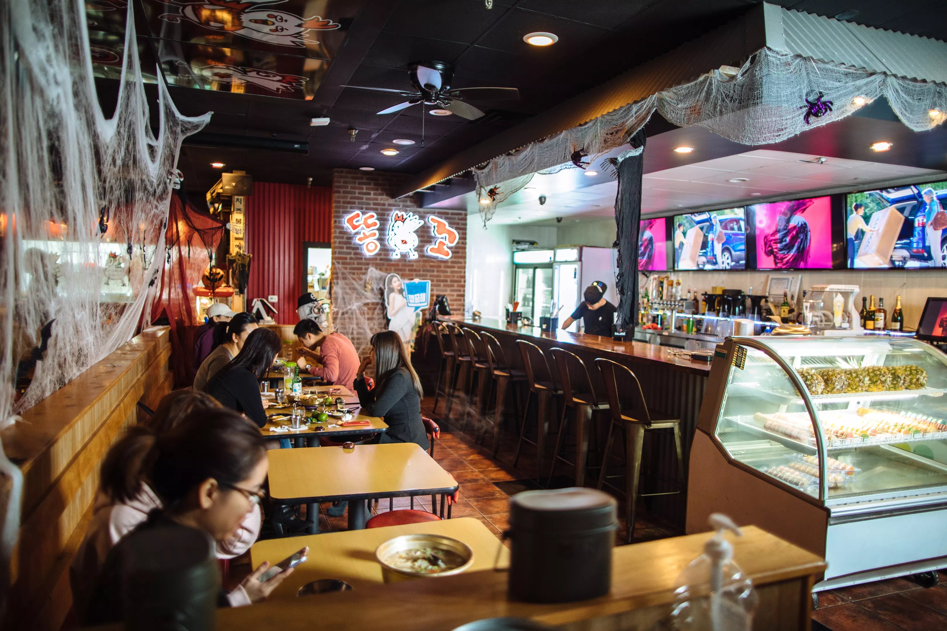 This bar – immensely popular with Carrollton’s Korean community, including older generations who don’t mind the high volume – pulses with energy at all times. Six big-screen TVs blast Korean pop music videos while the songs play on the bar stereo. There are more TVs for sports, photographs of Korean soccer heroes and a graffiti wall blocked off by decorative industrial fencing. Some of the tables are kid-sized, short and squat, with shockingly comfortable tiny leather chairs.