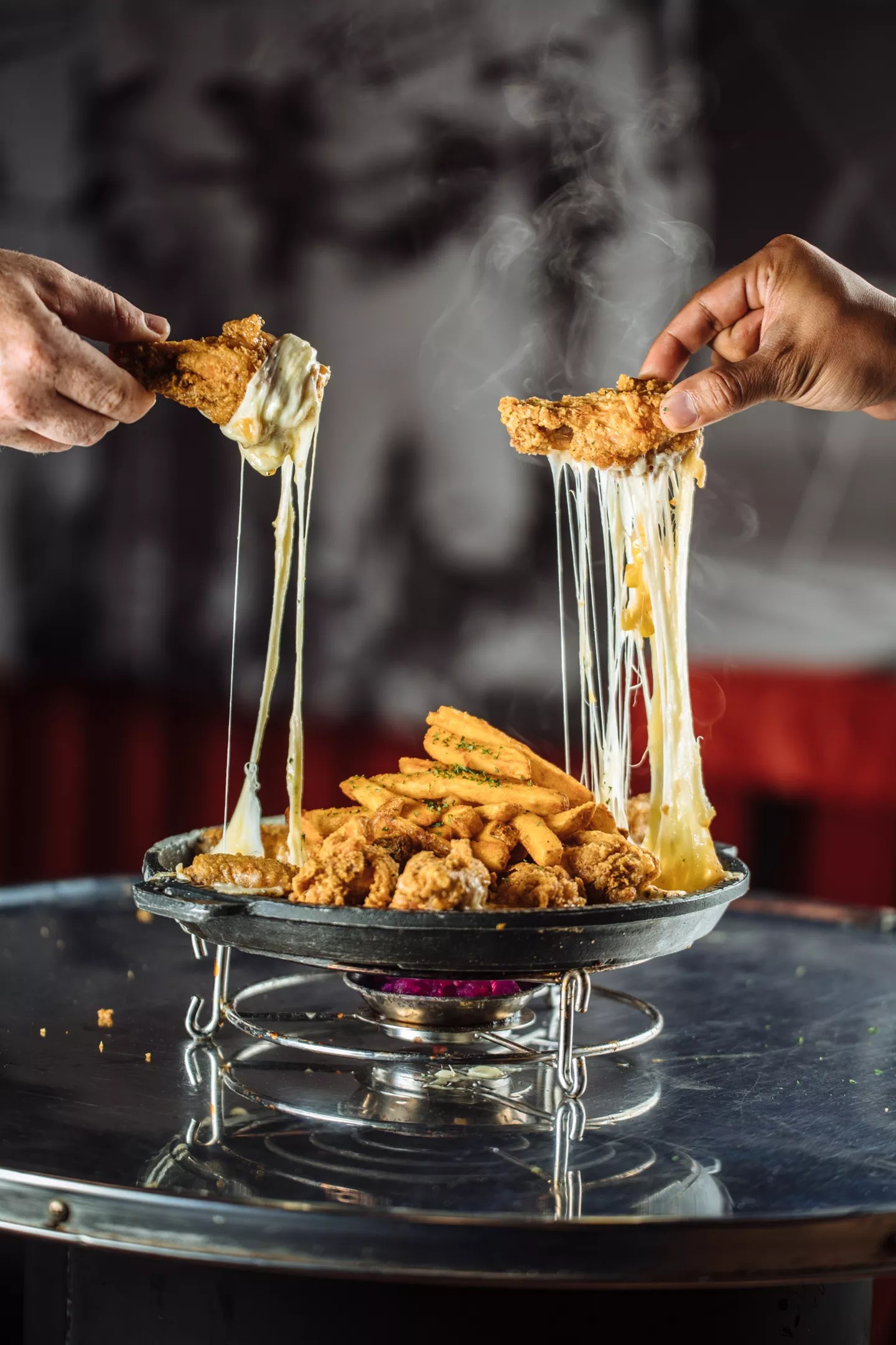 Ddong Ggo’s house specialty is a dish called Cheese Island ($25). It’s a large cast-iron skillet with dividers running through the middle, filled entirely with shredded white cheese. The skillet is set atop of a burner on the diner’s table, so the cheese begins melting within moments. The cheese is the ocean: Cheese Island is the pile of fried chicken wings and fries stacked like Jenga blocks on top.