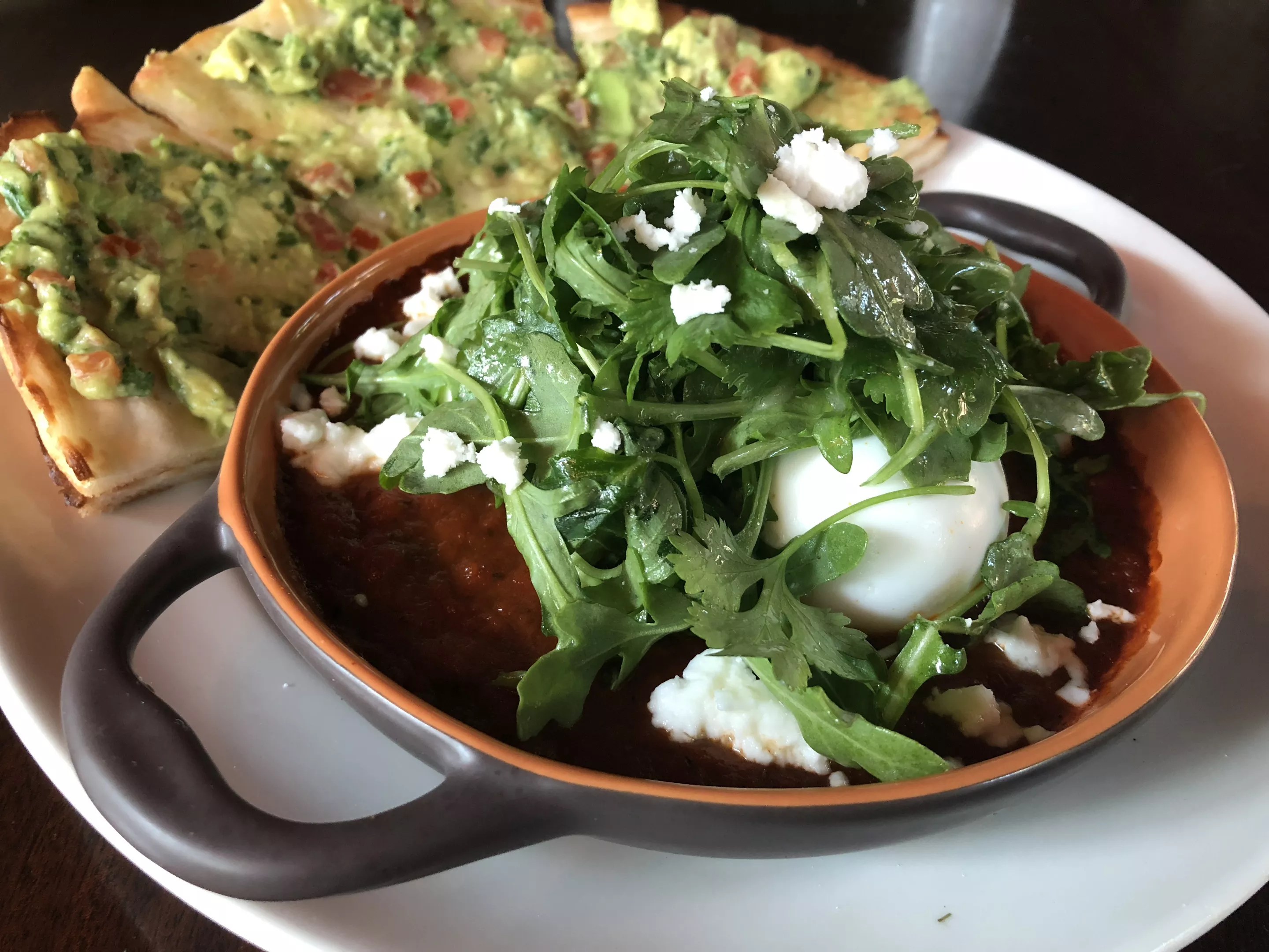 Speaking of too much green: The eggs in purgatory ($14) are almost good. Three poached eggs sit in a shallow dish of roasted tomato pepper sauce, but the rough arugula and ample parsley are overwhelming.