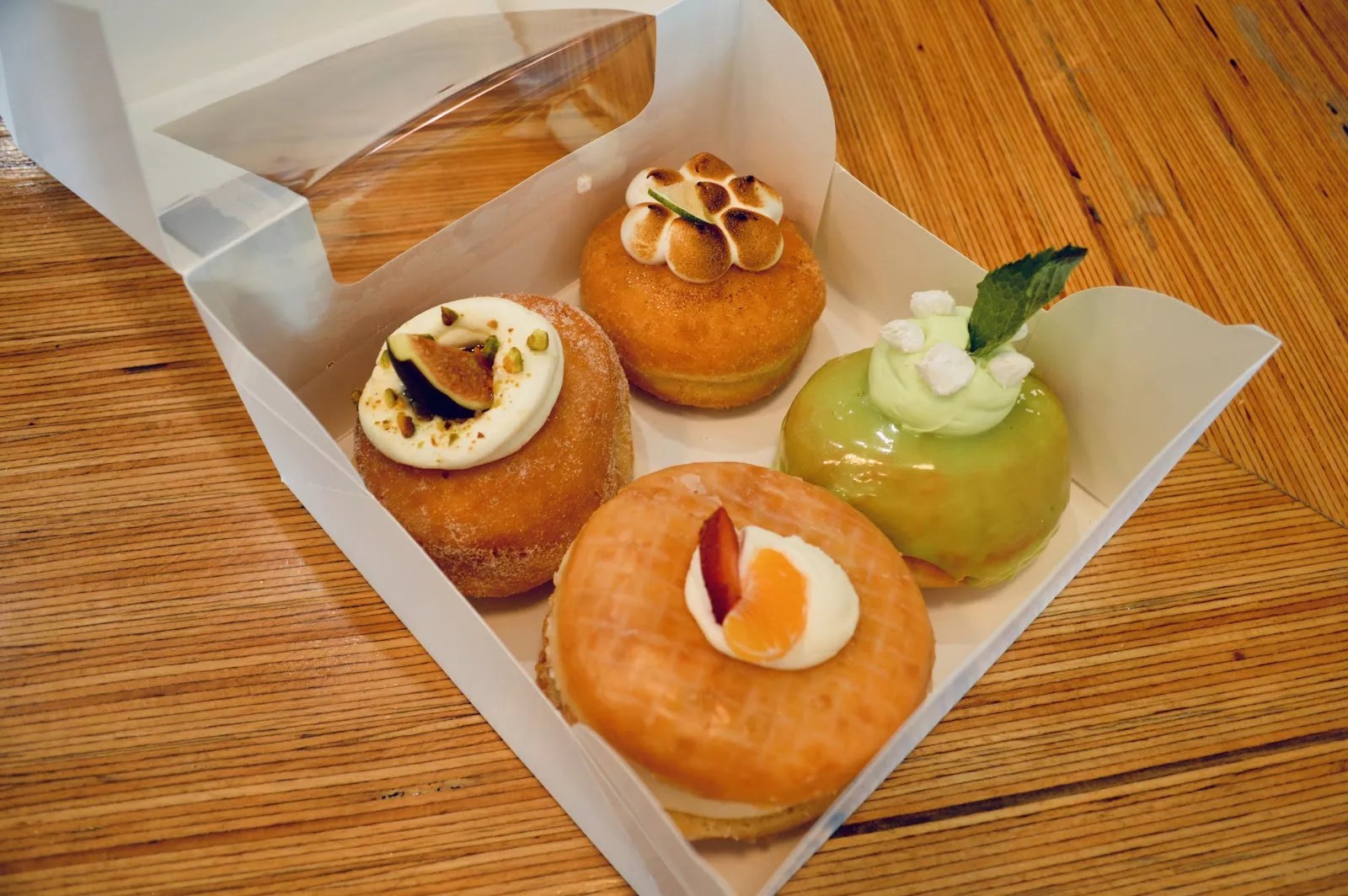 Customers (or “Detourists”, as they are endearingly called) get to enjoy offerings from 8 a.m. to 2 p.m., which is only made possible with a 4 a.m. start time for the staff, with several ingredients prepared the night before. The dough goes through a series of stages: mixed, kneaded, rolled out, cut, fried and scooped away when ready. Each doughnut is carefully decorated, topped with either a generous slather of glaze, fresh whipped cream, a glass-like coating of caramelized sugar or drizzles of tempered chocolate, then finished with fruits, nuts, herbs or sprinkles.