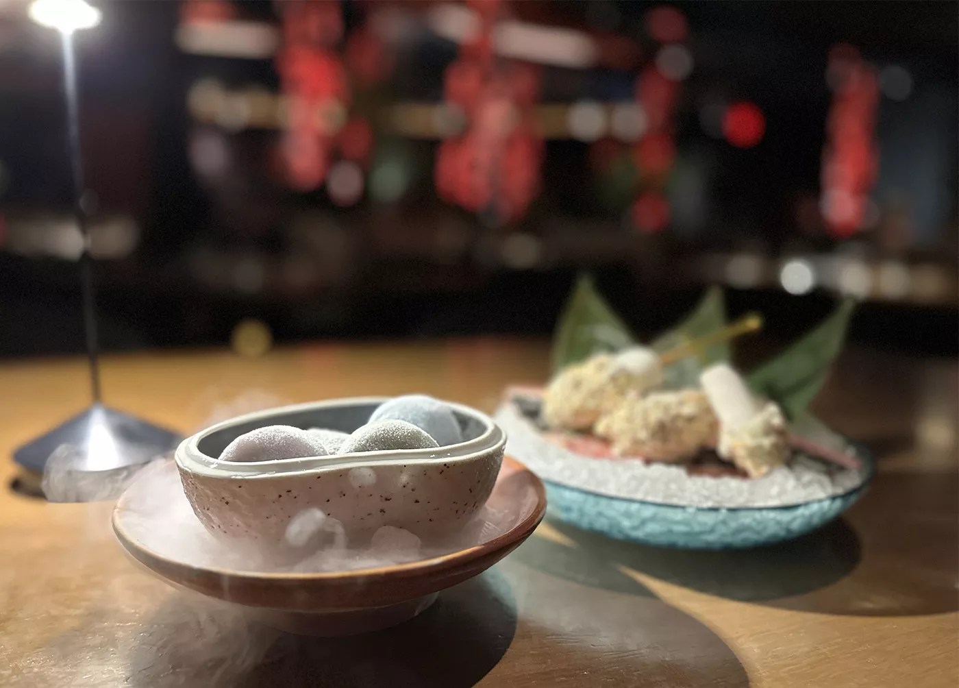 Another option for the second course is the Szechuan NY strip ($60 a la carte) served with matchstick potatoes. We ordered it medium rare; it was served that way, but it retained too much heat and was well done by the time we took a bite. Smoky mochi is part of the show at Komodo. Desiree Gutierrez