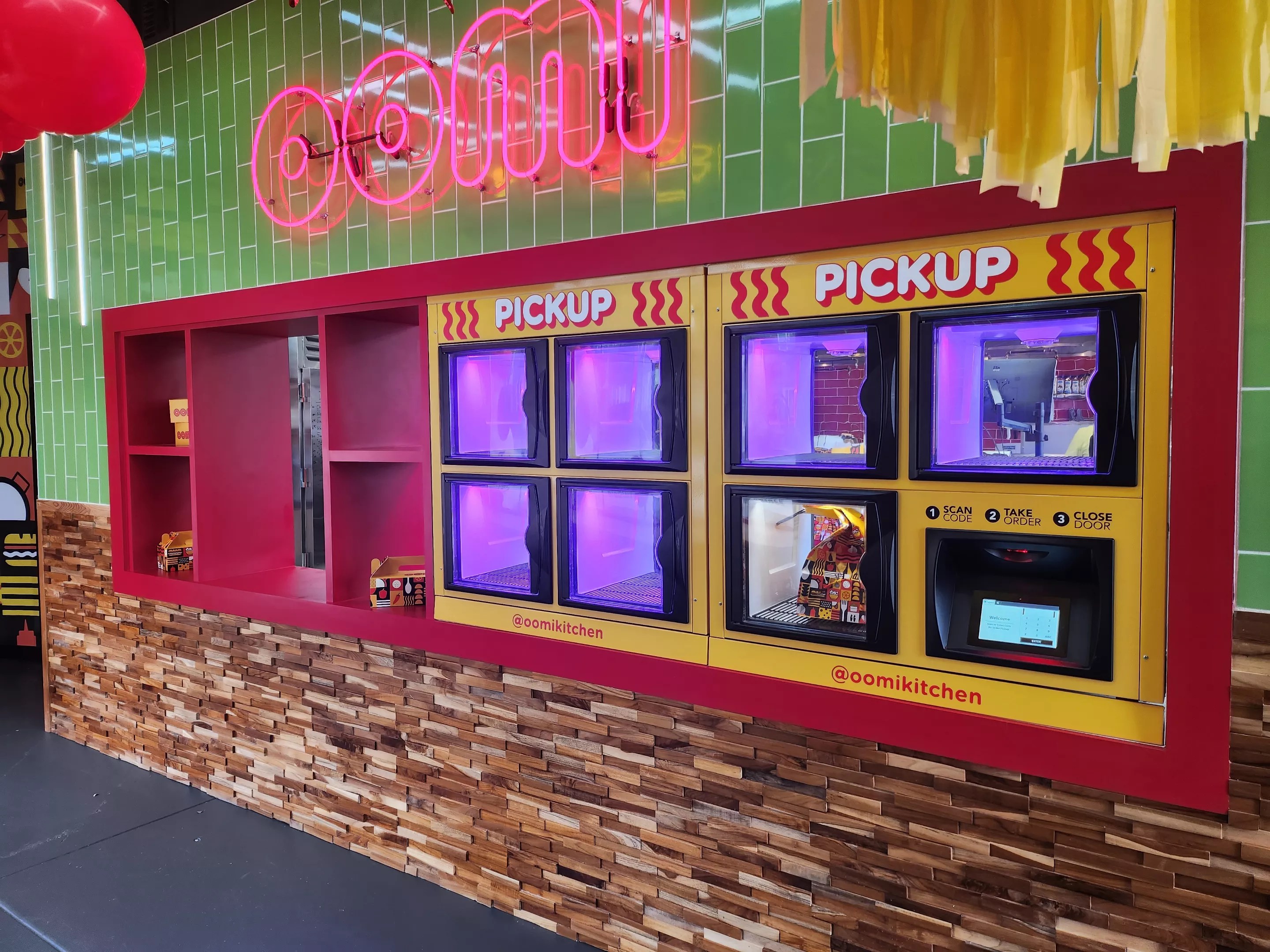 We dropped in recently to experience OOMI in person. You can’t dine in. All you’ll find is a small pickup area with seven neon-lit OOMI boxes and a single kiosk. Through the see-through lockers, you can peer into the 2,250-square-foot kitchen. We scanned our QR code and voila: our locker unlatched and there was our meal. Pretty cool. Order in hand, off we went.