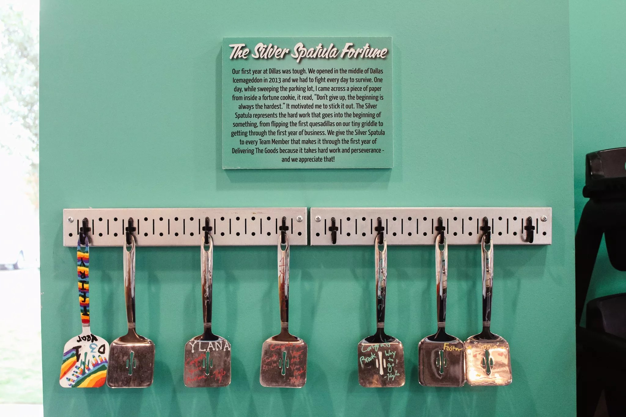 Kyle was also inspired by a fortune cookie message he came across: “Don’t give up; the beginning is always the hardest.” Kyle gained first-hand experience at that “hardest part” when he opened the first Dillas during a winter storm in 2013. He’s created the Silver Spatula award to give to every employee on completion of their first year. A spatula “trophy case” and the fortune cookie story are displayed in each store.
