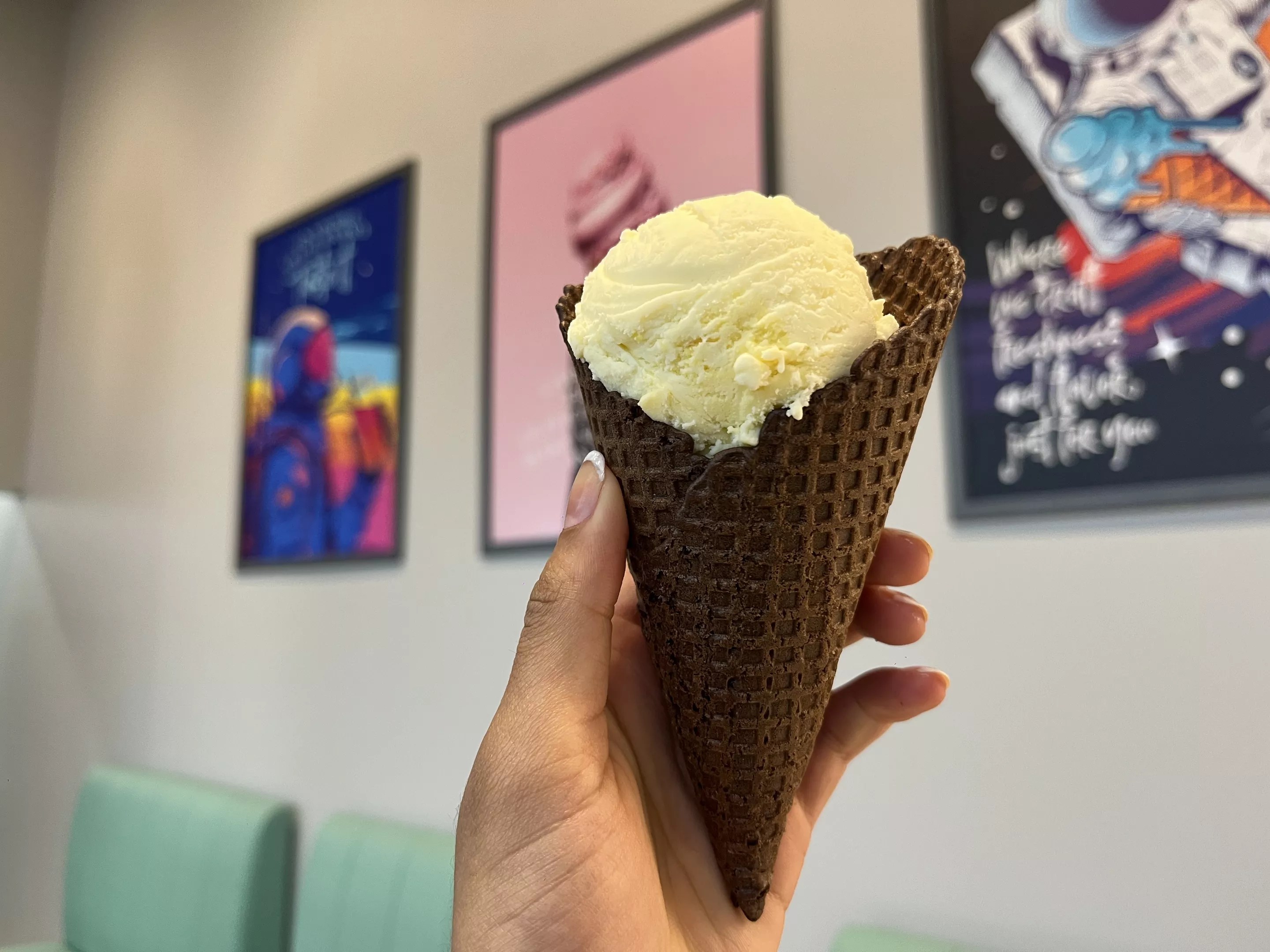 Chocolate waffle cones are a light and airy backdrop to bold ice cream flavors.