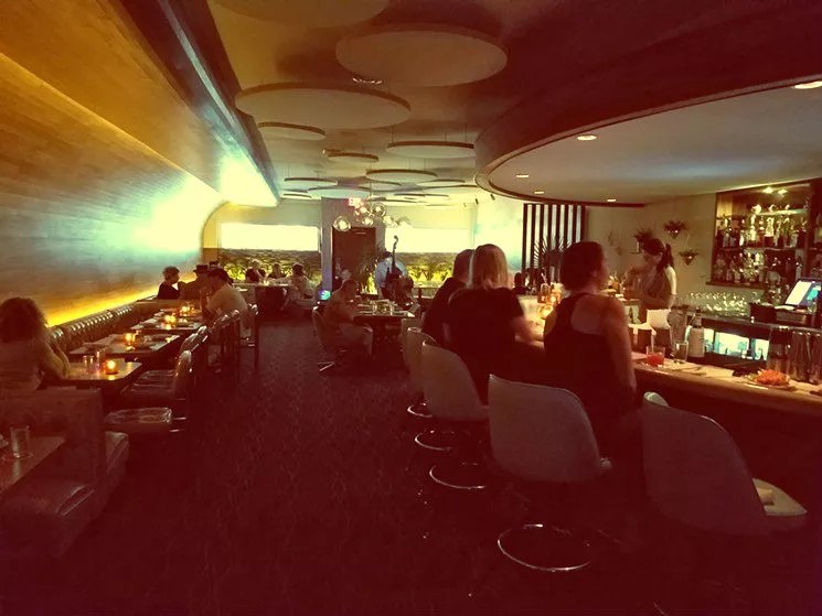 Once inside, that cool factor becomes an oil slick of ’70s swank. With lights set low, candlelight illuminates vinyl-wrapped booth seats, velvet chairs and a photo mural of Marfa. The look tempers a late midcentury airport lounge with a Palm Springs vacation home, and the overall effect is both retro and exceedingly soothing, akin to watching an episode of Bewitched while on benzodiazepines.