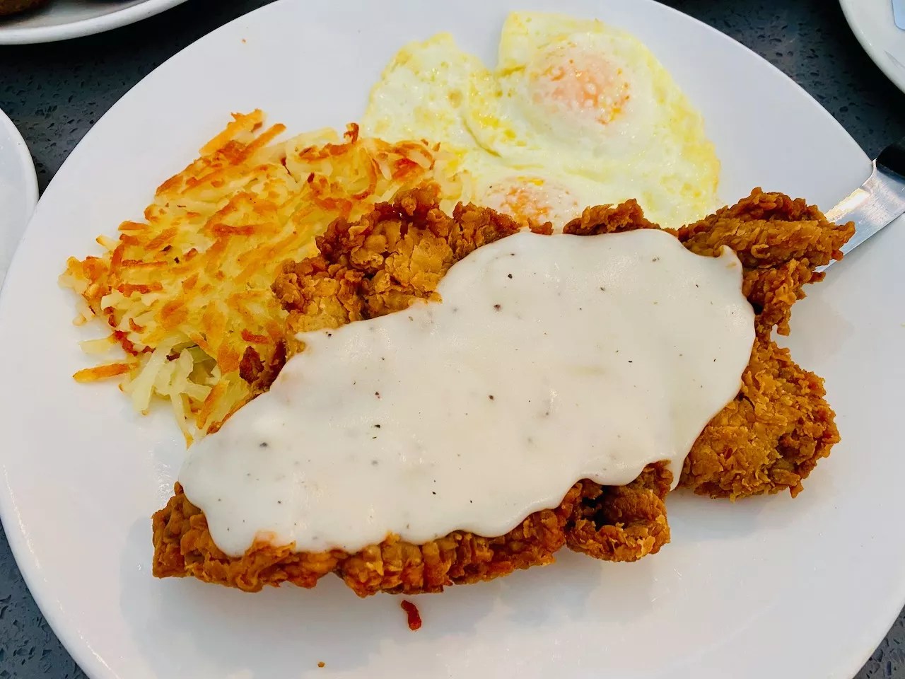 We also had the chicken-fried steak, which had a nice blanket of gravy and was cozied up with two over-medium eggs and hash browns. A crisp exterior gave way to a tender bite inside. We chose pancakes for the side, which was just as delicious as the waffle but fluffier.