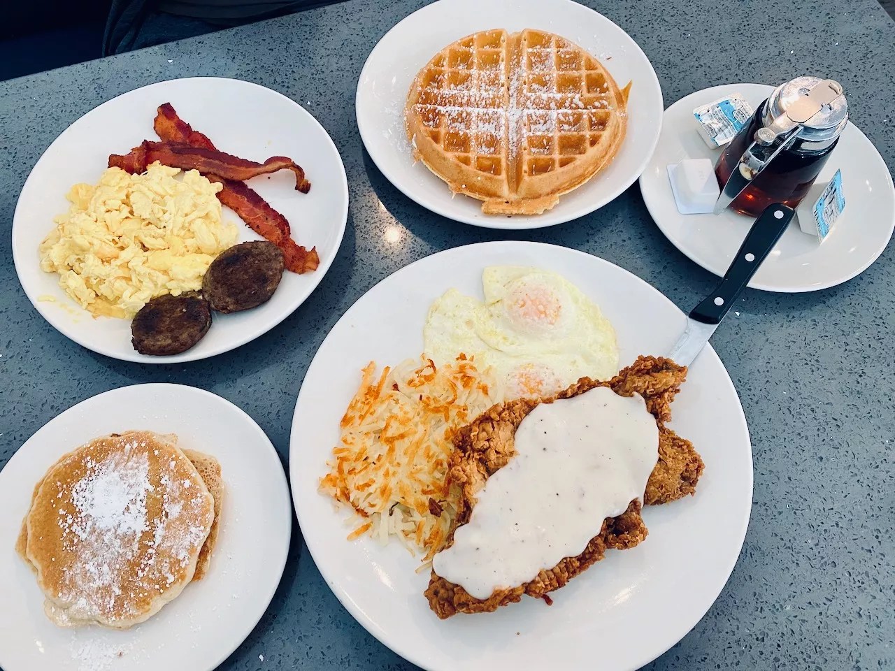 We also had the chicken-fried steak, which had a nice blanket of gravy and was cozied up with two over-medium eggs and hash browns. A crisp exterior gave way to a tender bite inside. We chose pancakes for the side, which was just as delicious as the waffle but fluffier.