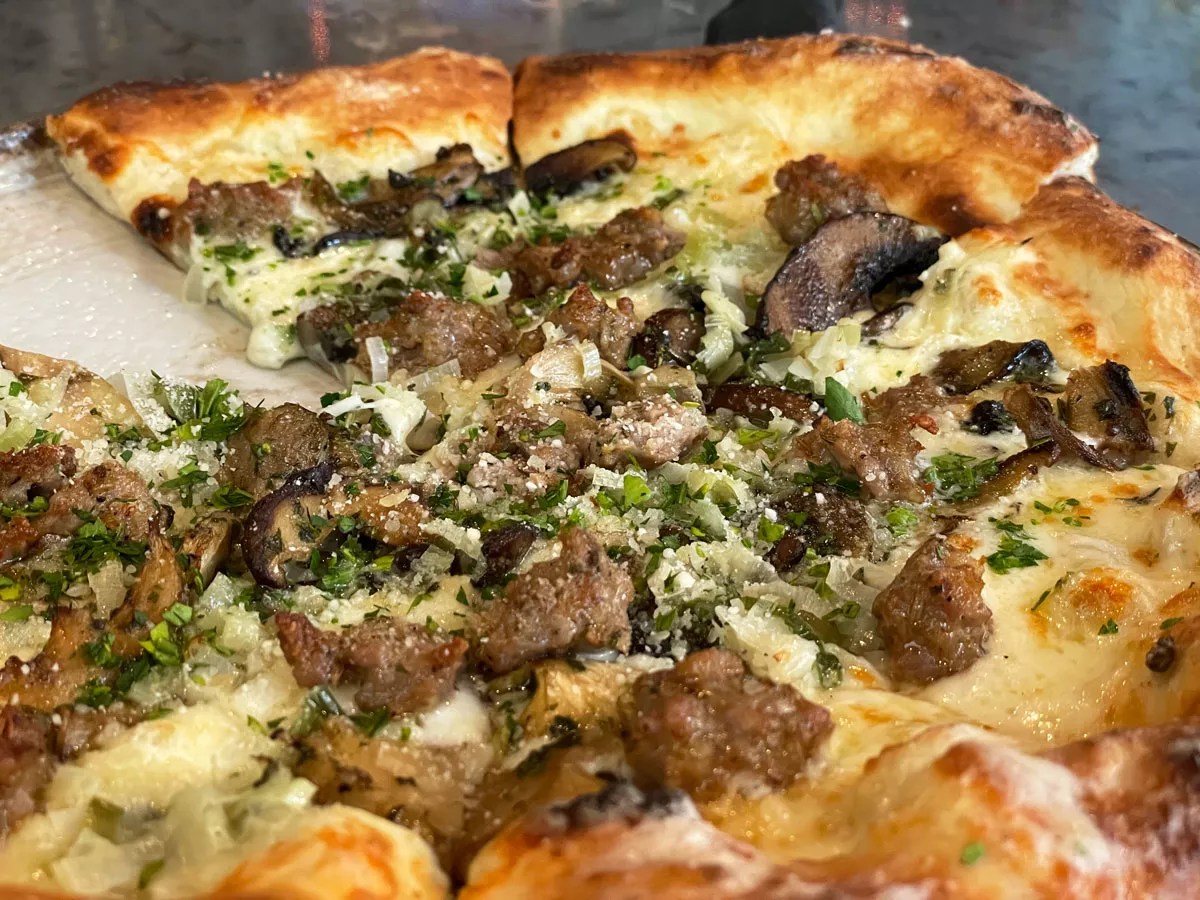 There’s no sauce, but the heavy-handed sprinkle of cheese plays both roles on top of the soft and pillowy crust. The combination of savory fennel sausage, mushroom and leek should hit the spot.