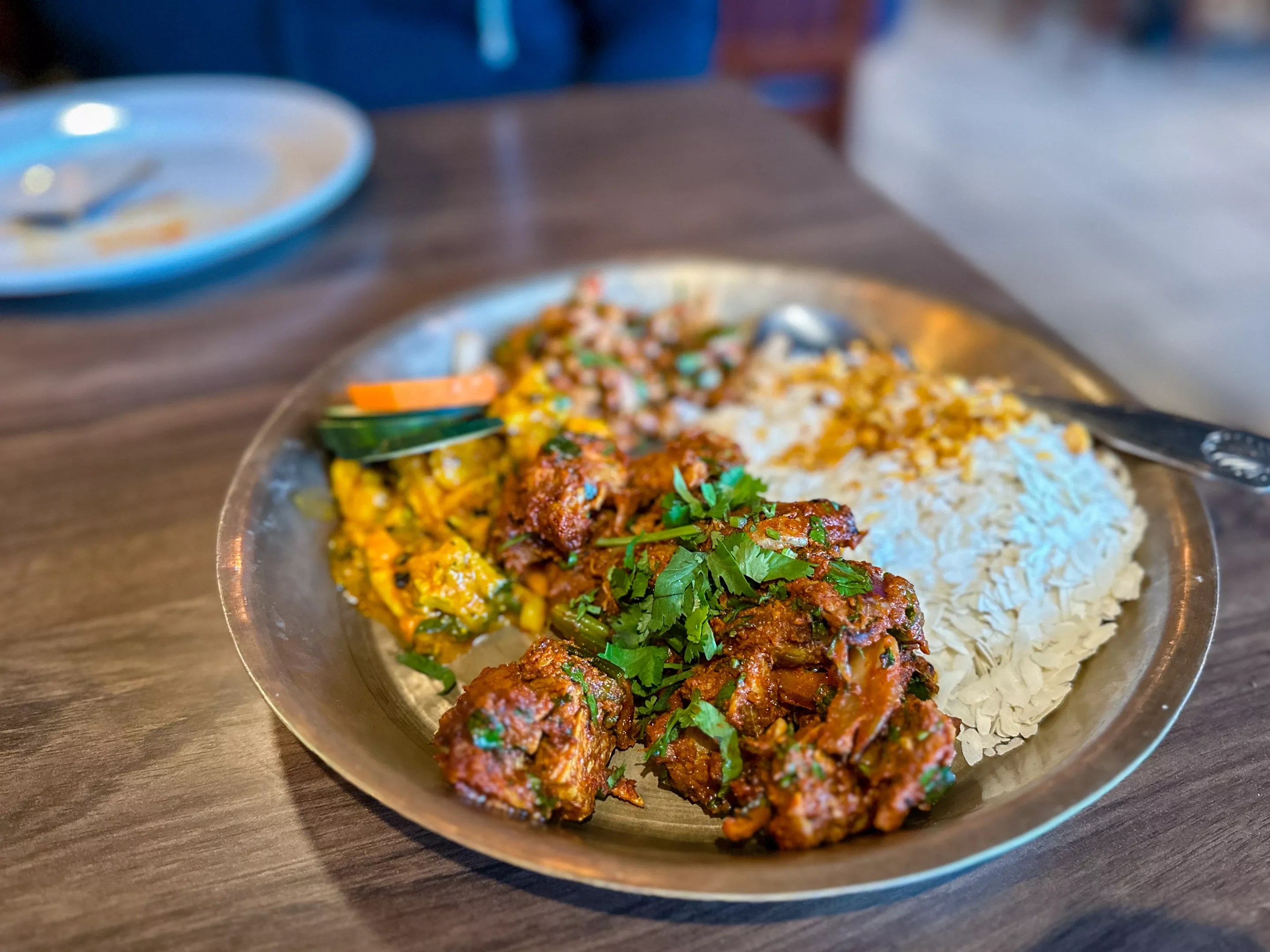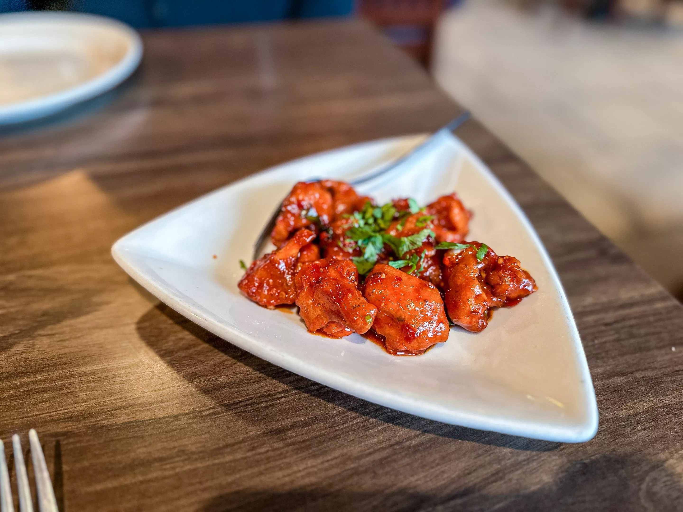 For our mains we went with gobi Manchurian and an order of choila, a Himalayan tiffin. The cauliflower dish was attractively presented in a not-too-spicy chili sauce garnished with red bell pepper, green onions and parsley. This was really a side dish, and the serving size reflected this, but it was just enough. Choila – BBQ chicken marinated with spices and herbs and served with flat rice, roasted soybean and aloo achar. Hank Vaughn