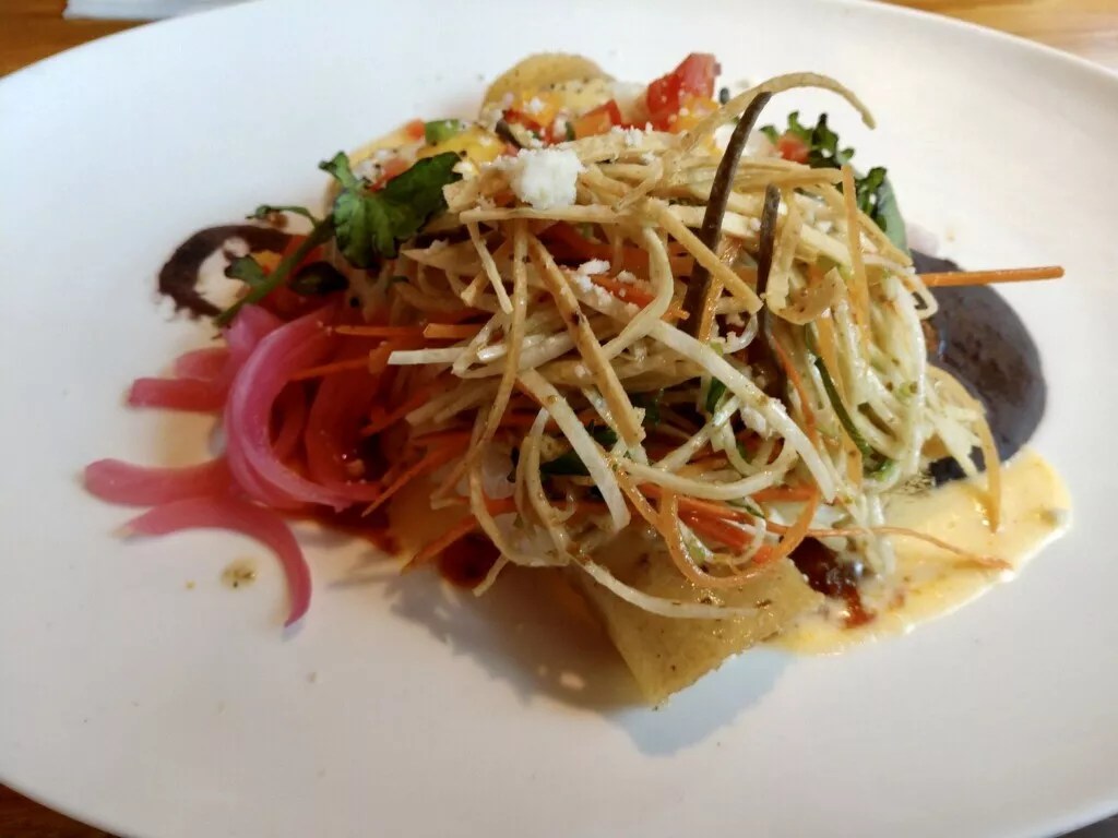 Carmella’s truck stop buffalo enchiladas may be the real highlight. On top of black bean puree, they’re topped with pico de gallo queso, basted farm eggs and served with a side of excellent cumin-carrot slaw.