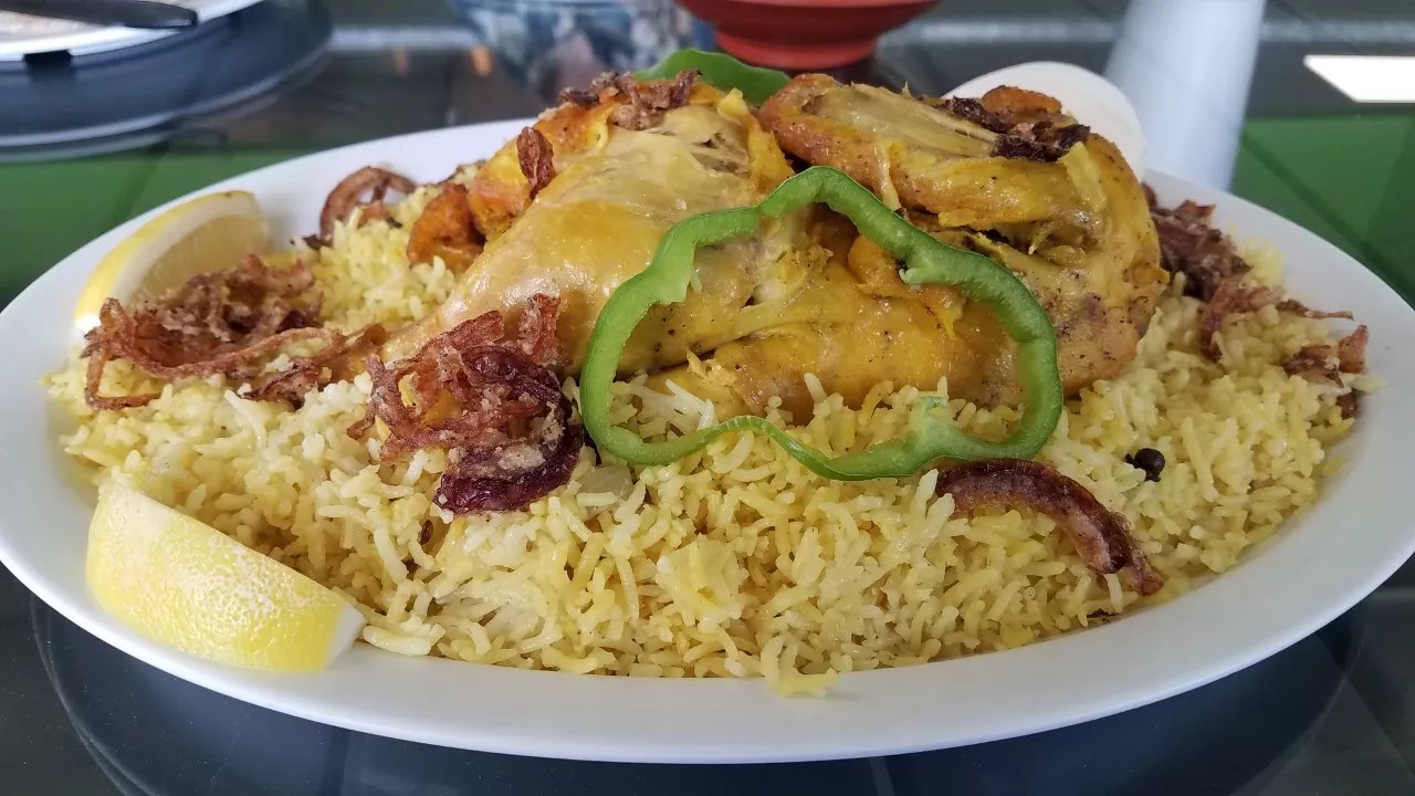 For our main course, we went with the mandi chicken on a fluffy bed of basmati rice. It’s $14.99 for a half chicken and is easily shareable among two. The aromatic, biryani-esque mandi was vibrant in a hawaij seasoning (a blend of Yemeni spices) and garnished with small, golden fried onions that we couldn’t get enough of.
