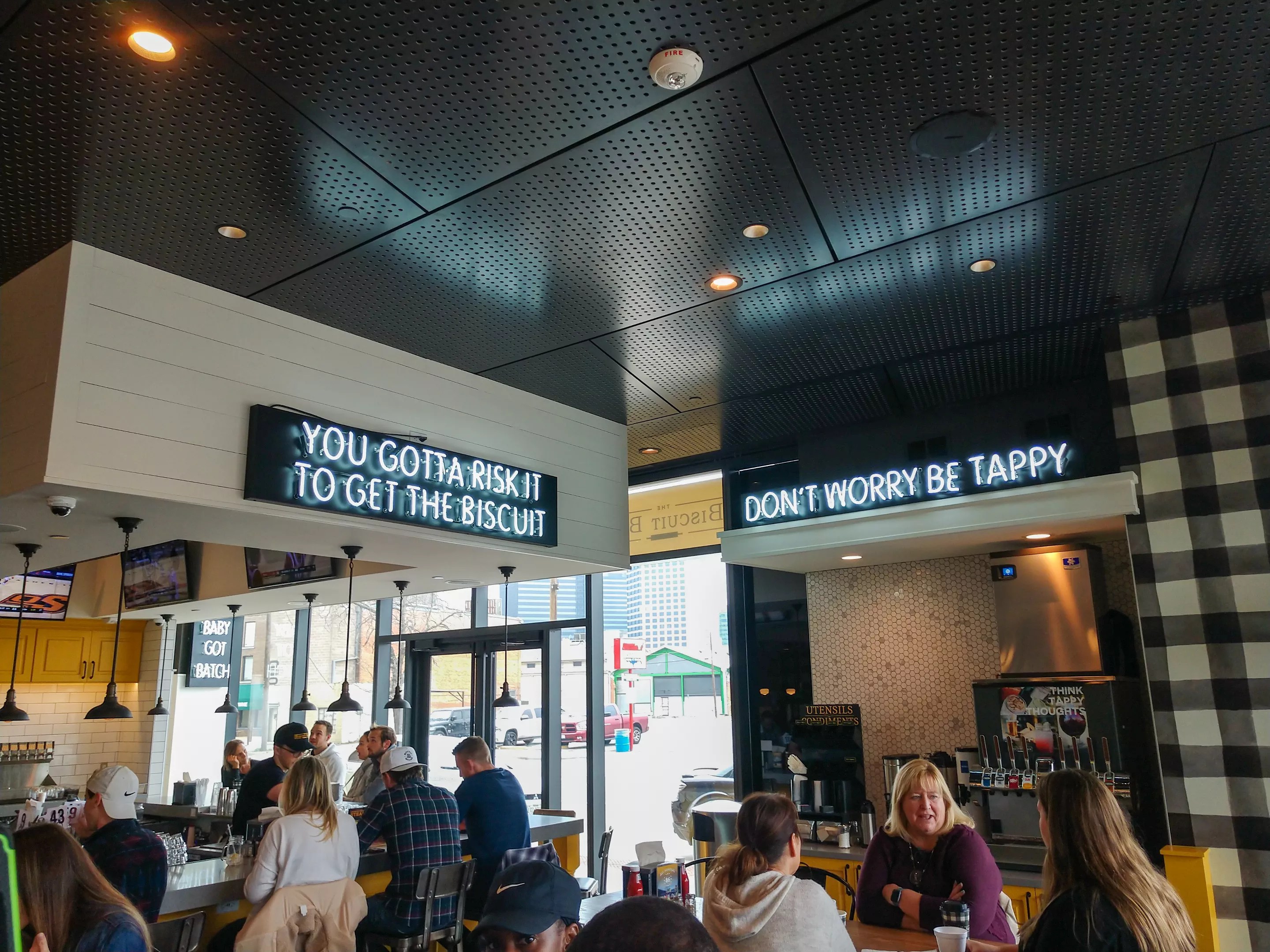 Almost every aspect of the experience at Biscuit Bar has an off-putting element. The design is super clean, country style but adorned with neon bon (?) mots that suggest that the author poorly translated jokes from another language to English. The friendly and attentive staff is forced to wear these strange word jumbles on their T-shirts, even the misogynistic one from the ’90s novelty rap track.
