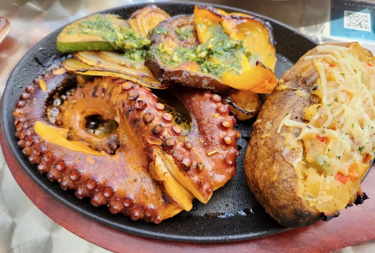 The octopus arrived on a sizzling cast iron grill still surrounded by a beautiful display of eggplant and a fully loaded baked potato. All I can tell you is that though I spent hours in honors classes in high school and AP English along with several years in a liberal arts college studying classic literature, the only way to describe my first bite of the grilled octopus was, “Holy Shit!”