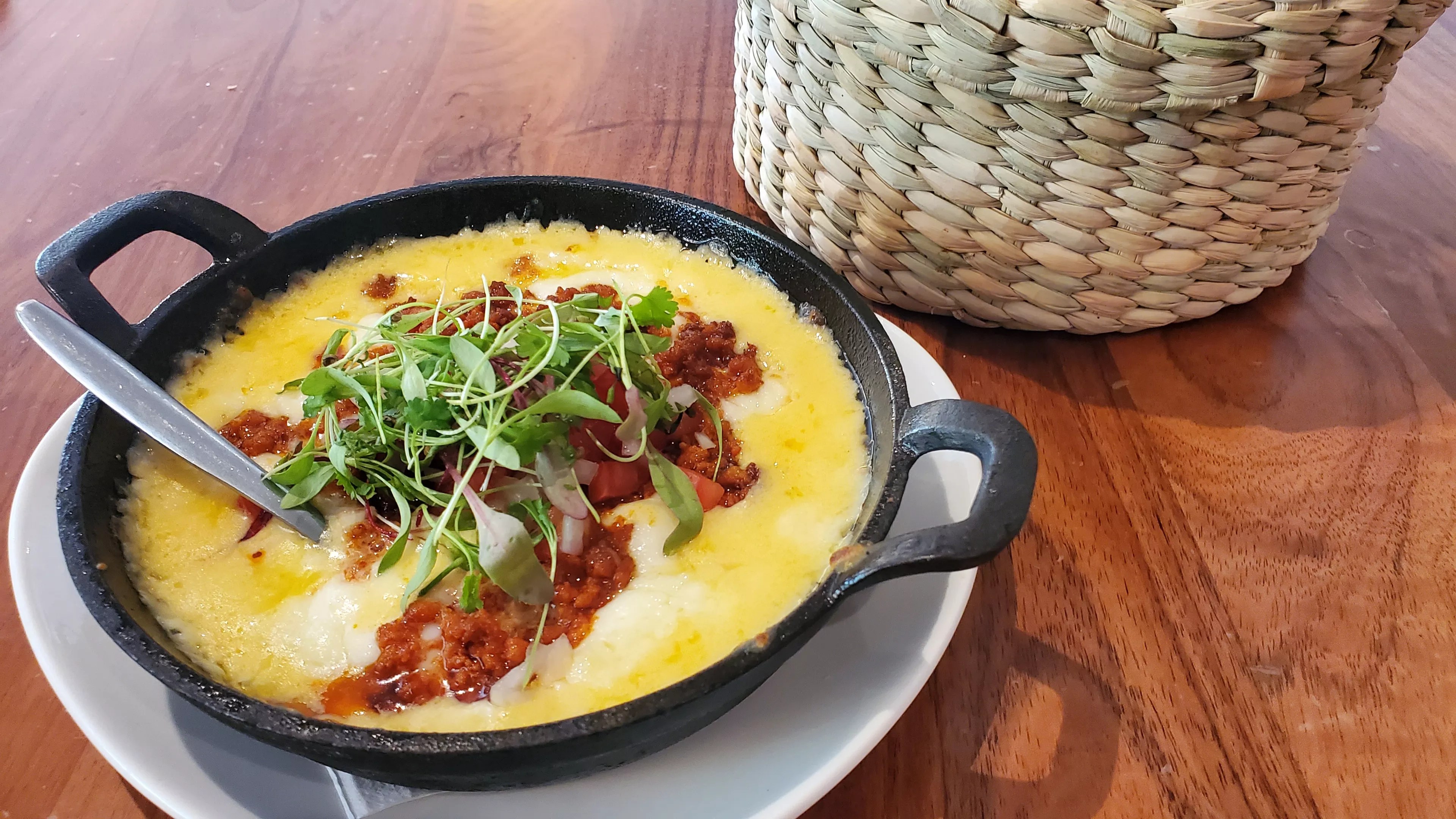 The queso fundido appetizer ($12) is served with a side of warm flour tortillas. The mix of melted cheeses stretches endlessly, and it’s a bit of an effort to corral it into a tortilla (worth the effort, however). It’s topped with savory chorizo, micro greens and diced onions and tomatoes.
