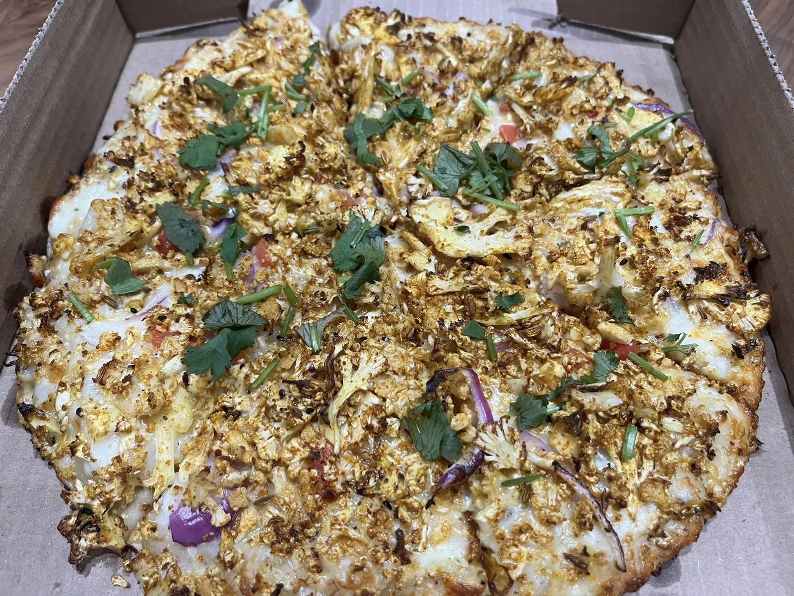 Another option, the Achari Gobhi, starts with a hand-tossed crust slathered in white garlic sauce. Covered in marinated cauliflower, onion and cilantro, this pizza is almost as good as the first at finding the perfect balance between a palate-cooling base and a spicy topping.