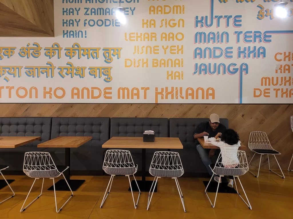 The interiors of Eggholic are far from the rustic, bare-bones street food carts that inspired most of the dishes here. Here it’s refitted for modern-day suburban American sensibilities. Yolk-yellow concrete floors spill throughout the space. Walls are filled with iconic lines from Bollywood movie greats, replicated in Hindi and Gujarati script. One wall screamed, “Wah Bhai Wah!” a Hindi phrase meaning “That’s awesome!”