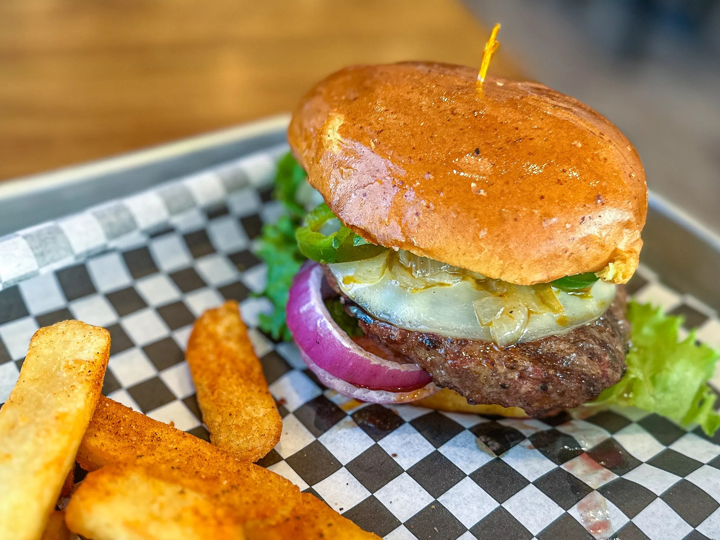 The jalapeño burger: provolone cheese, tobasco jalapeños, lettuce, tomato and onion.