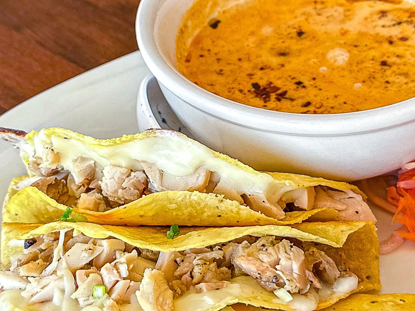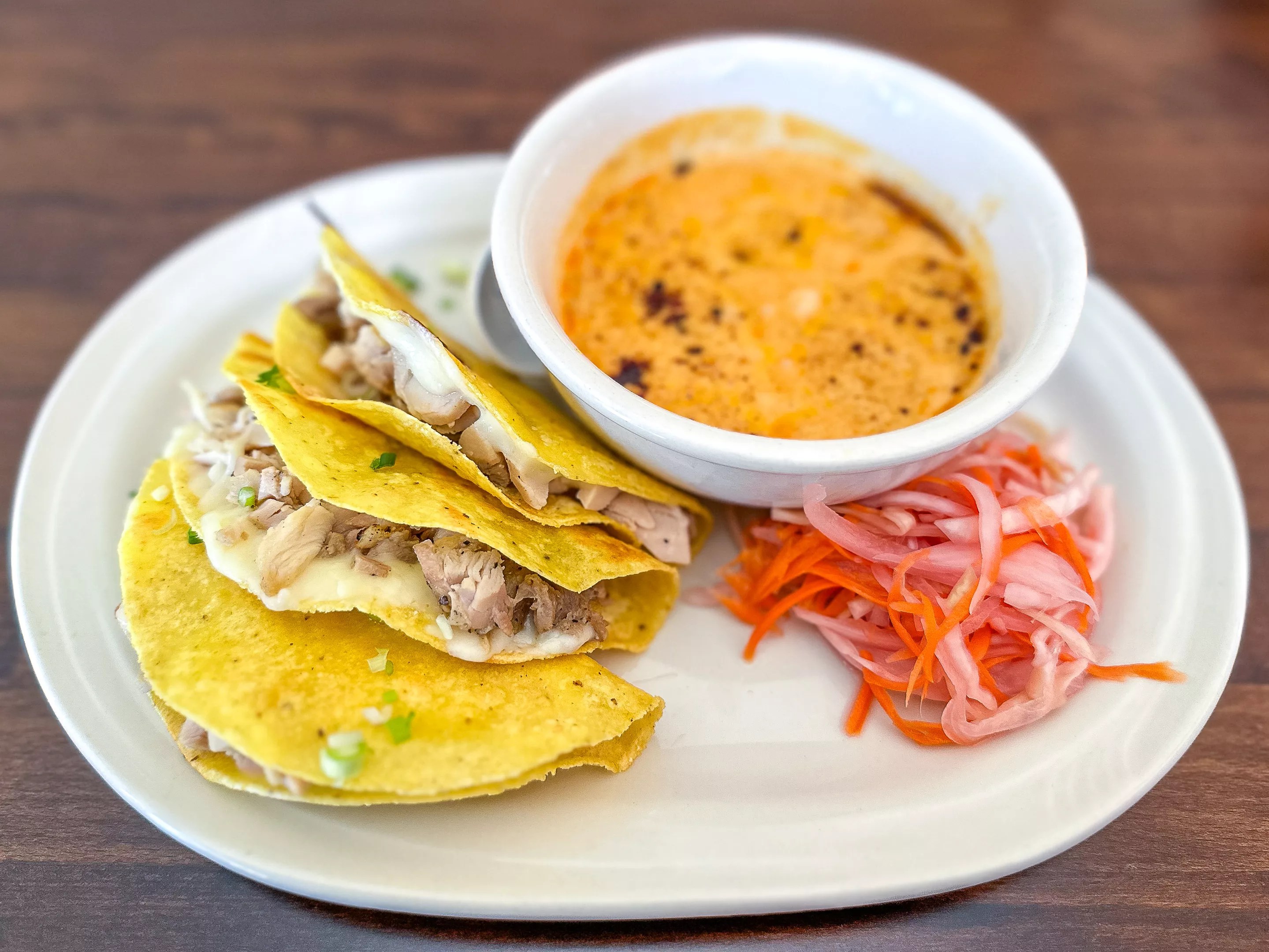 Our fusion choice was the queso curry taco plate. This is three tacos with grilled chicken, curried tofu or birria, with cheese and house-made garlic chili oil. This is served with a yellow or red curry dip on the side and pickled onions. We went with grilled chicken and red curry.