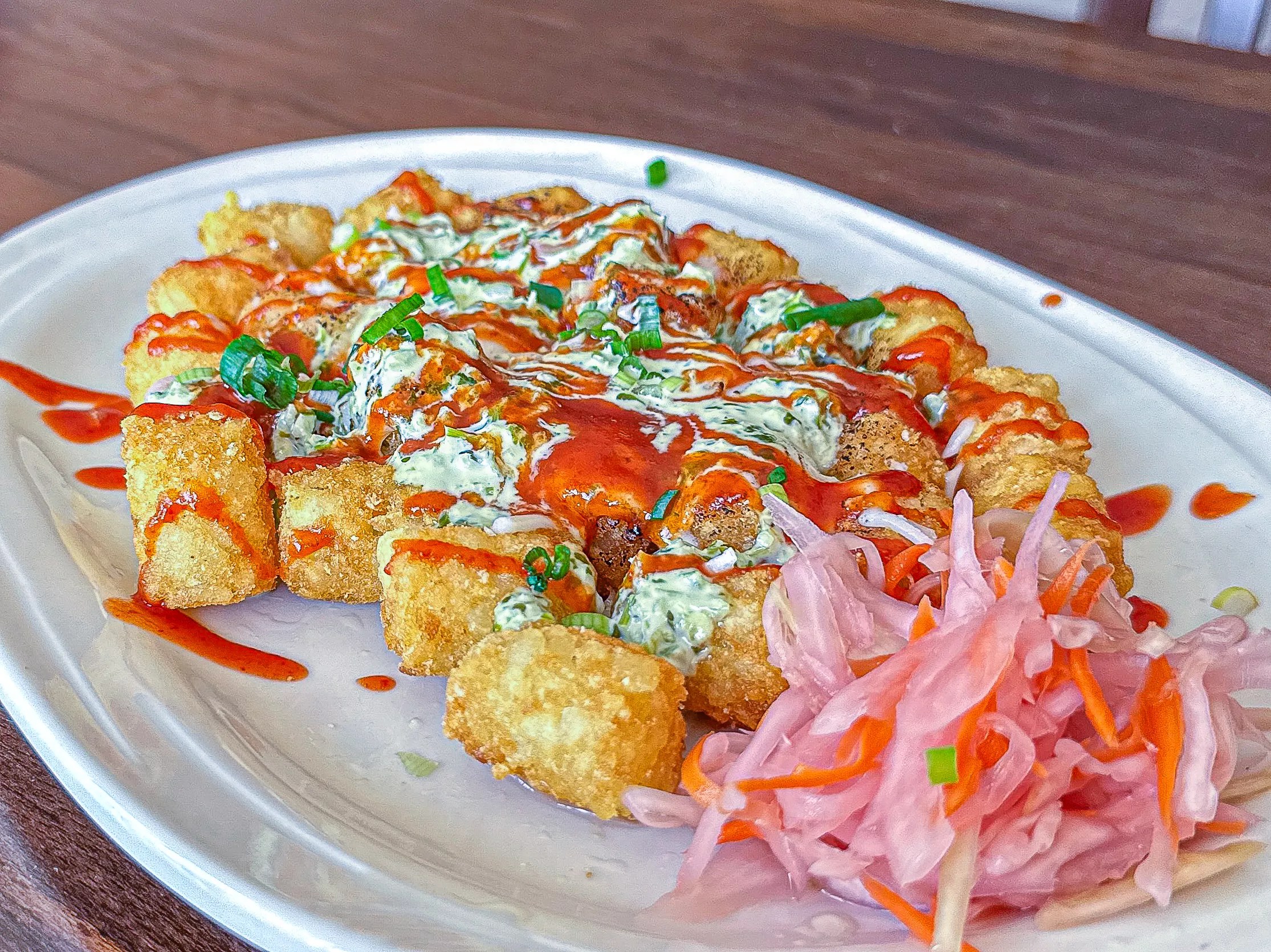 Dirty tots: chose spicy Thai crema or zesty Tom Yum mayo, with cheese, sriracha and green onion.