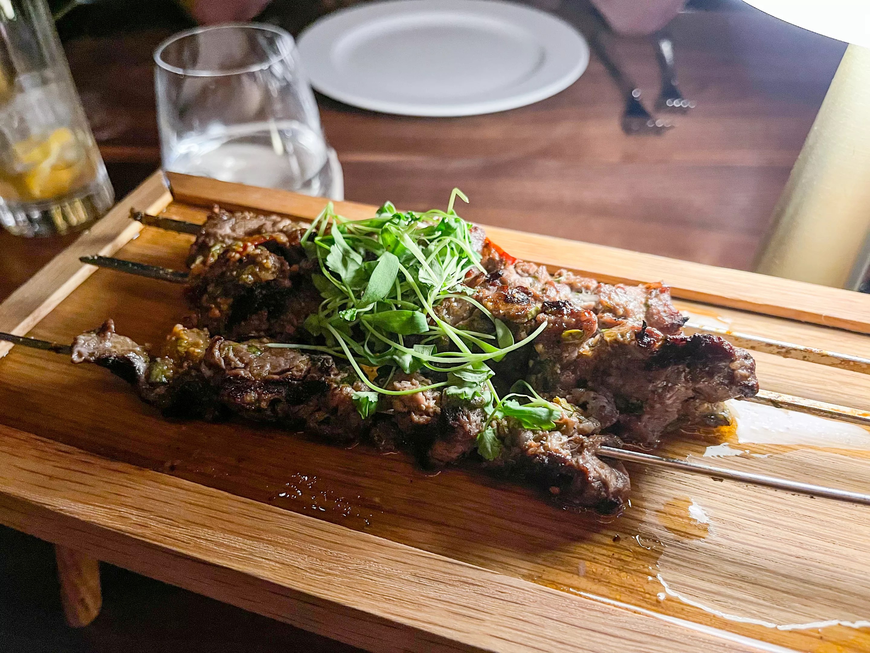 But first, the cocktails. The Italian Job combines Bulleit rye, Cynar apéritif, Carpana Antica and some Luxardo cherries ($19). It’s a nice enough cocktail to start the evening, except for the large ice globe they set in the shallow cocktail glass. It screamed trouble when it arrived, then about halfway through, the ice prevents you from drinking the rest – unless you like the feeling of an ice cube against your nose, but it’s safe to say that’s not a cute look. Peruvian anticucho skewers Taylor Adams