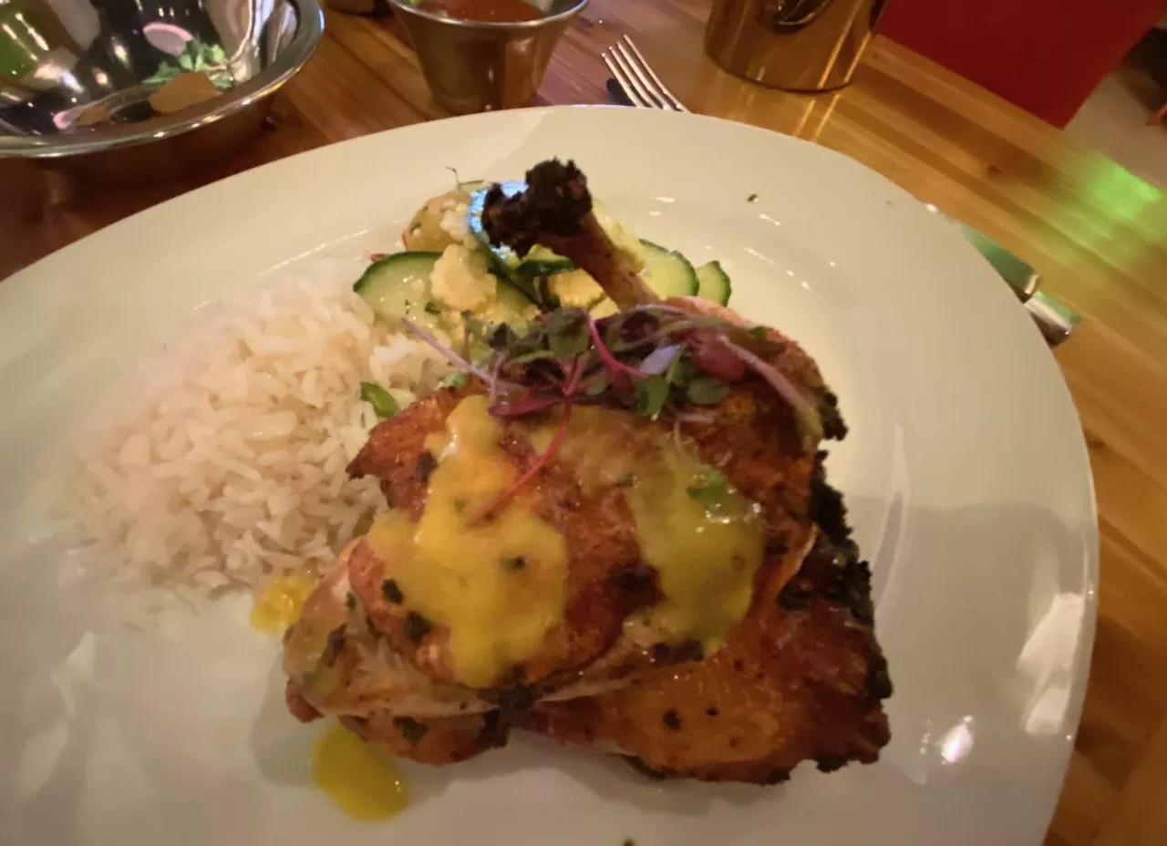 We went with a plate of brisket tacos with rice and beans ($16) for our main. The house-smoked brisket topped with tangy tomatillo-pineapple relish and habanero sauce was spot on. It’s a plate of Tex-Mex that doesn’t inflict the lingering hours of miserable fullness that can often follow such a meal. Crackling Pollo Lauren Drewes Daniels