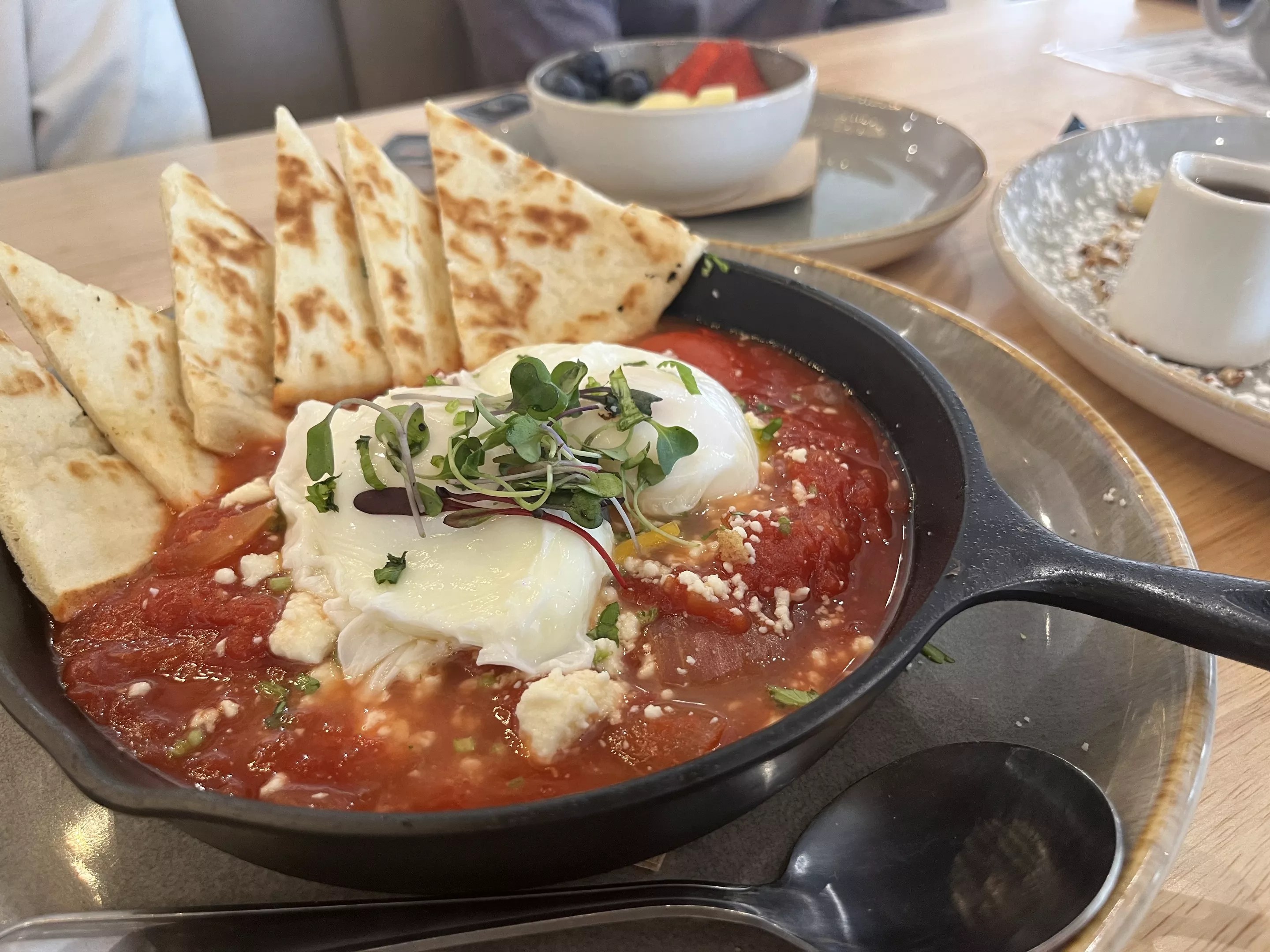 Given the name, it’s no surprise that much of the menu here capitalizes on the age-old poached egg. Order the shakshuka ($15), a griddle filled with simmered onion-and-tomato stew. This Poached specialty is a brunch-ier version of the traditional Moroccan dish, with a poached egg on top that breaks open effortlessly to the touch. It’s a little messy, but you can scoop it up with the warm pita bread that comes on the side. The Poached shakshuka comes with two poached eggs on top. Anisha Holla