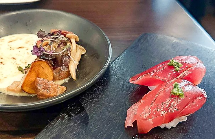 Signature cocktails are $10 during happy hour. We had the best of both worlds with a komorebi ($10), which is crafted with Hendrick’s gin, St-Germain and riesling. We paired it with bincho ($10), albacore and maguro (big eye tuna, $9) nigiri – two pieces of each.