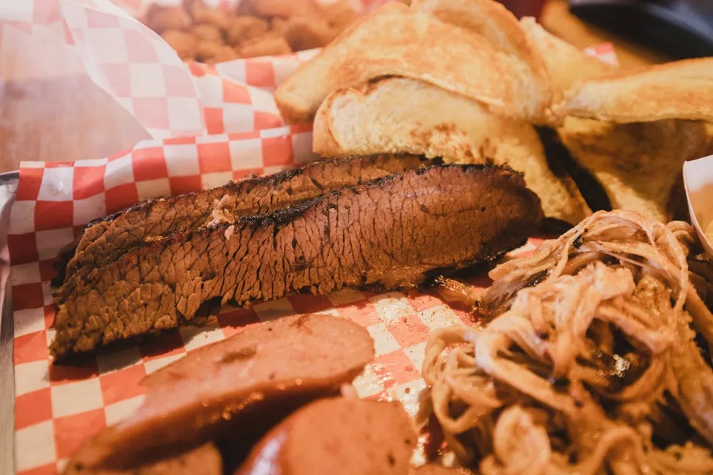 Textbook smoky brisket, sausage and pulled pork from Flatrock Smokehouse.