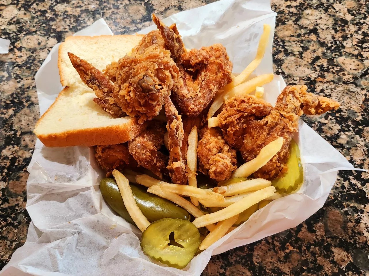 We decided on a four-piece mixed basket and a basket of fried wings. With a bag full of piping hot chicken and the aroma wafting through the car’s interior, our patience getting home was tested. We briefly (but strongly) considered pulling over into the parking lot of a CVS and eating right there.