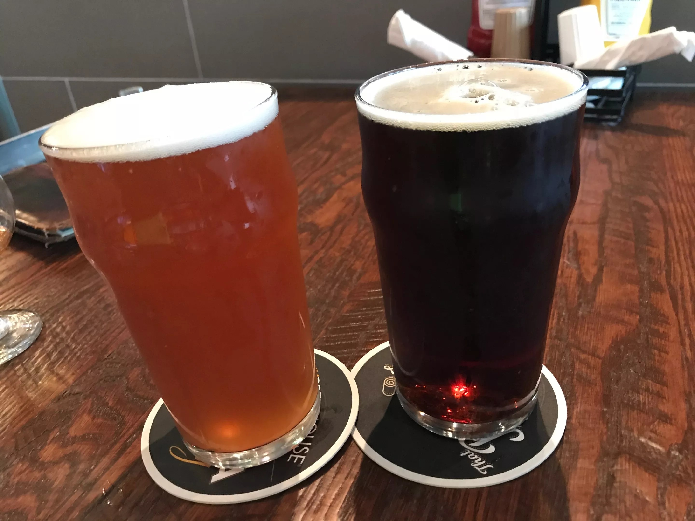 Unlike a standard brewery taproom, you cannot order a flight of beers at Flix. The bartender offered a small taste of whatever we wanted to try, but you can’t sit down with a neatly poured row of four or six brews to casually sample and compare. But you can order crowlers to go, and for an additional $1 you can “trade up,” as it is called on the menu, any standard pint to a 20-ounce “imperial pint,” so that’s a fun option not available at many non-movie theater brewpubs.