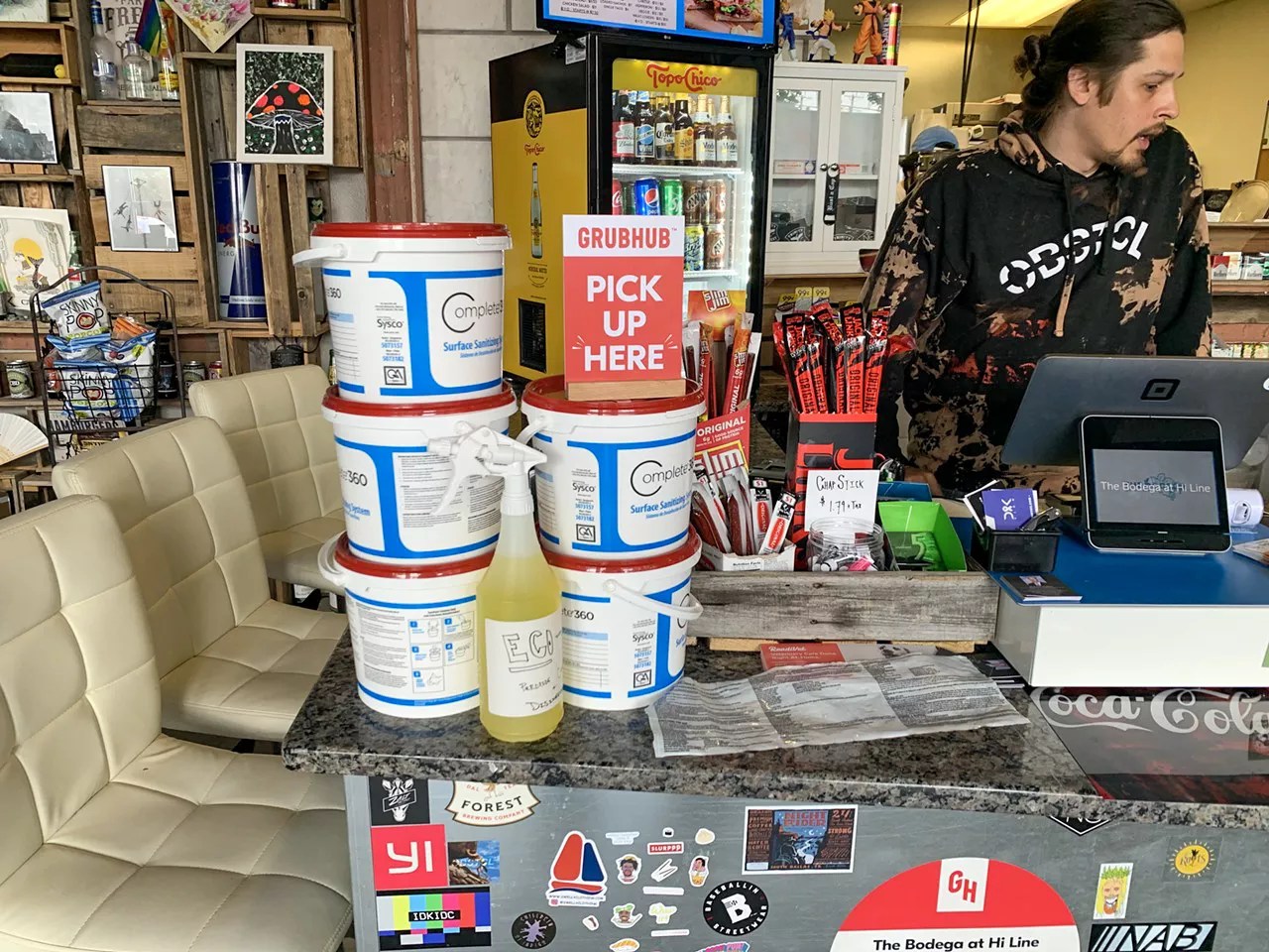 A chess board sits empty on the communal table. It’s honestly welcoming to see a staffed-up bodega, walls clustered with everything an apartment dweller would need without leaving the building. They’re cleaning often and furiously. The bodega’s business has peaked and valleyed over the past few weeks, but the sandwiches are as good as ever, Castañeda-Cudney assures, and they’re open late.