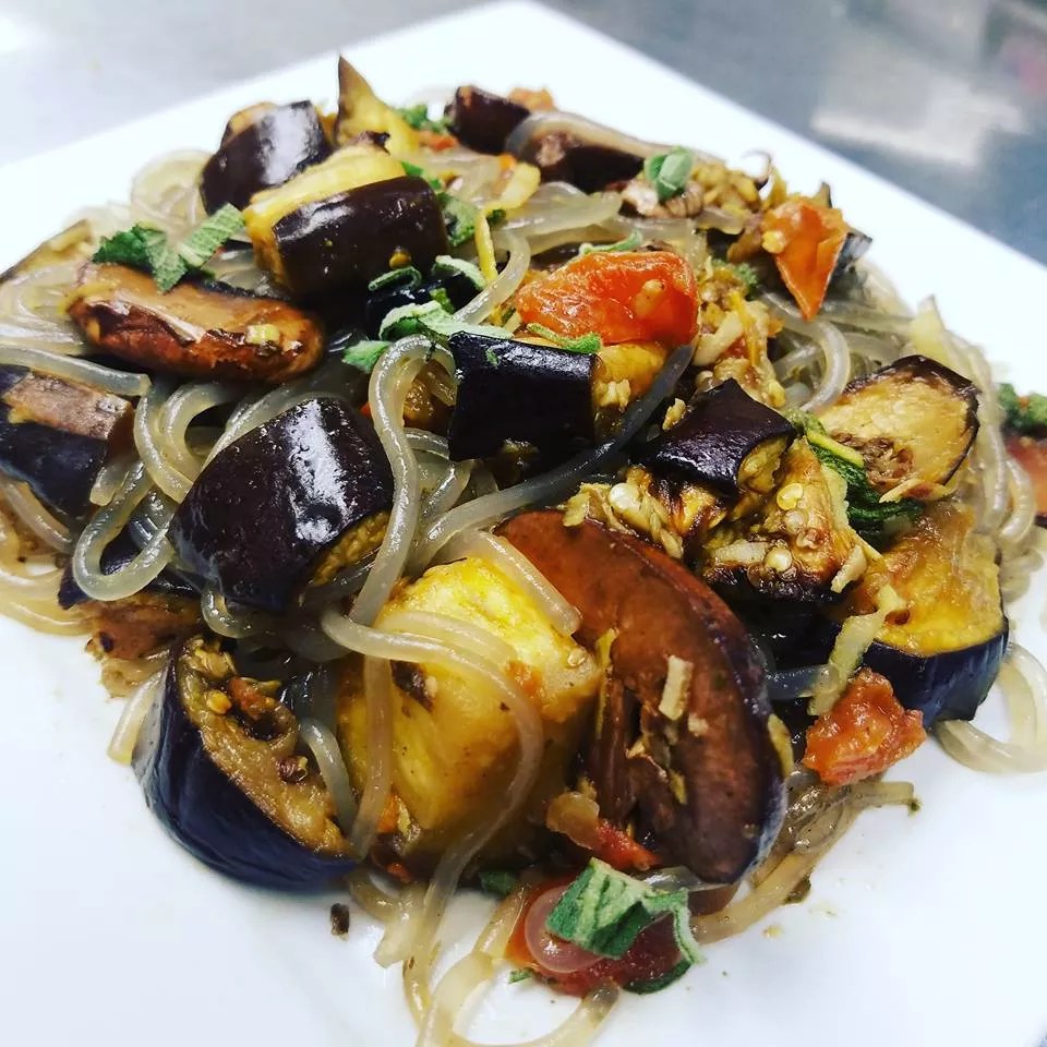 Oven-roasted eggplant, tomatoes, curry, mushrooms, almond milk, sage, coconut and potato starch noodles from Wholesome Grub.