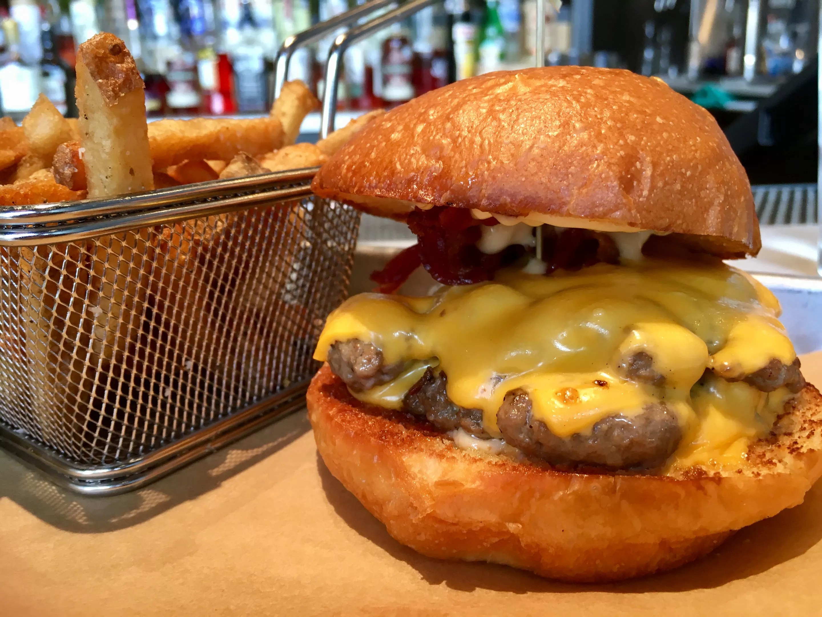 I polish off half a cheeseburger in no time. This is the kind of sandwich for which you lean into your stranger neighbor and talk about how good it is. Sharing the counter, the clatter of cocktails going, you’ll feel the urge to discuss the forces of a simple and great cheeseburger.