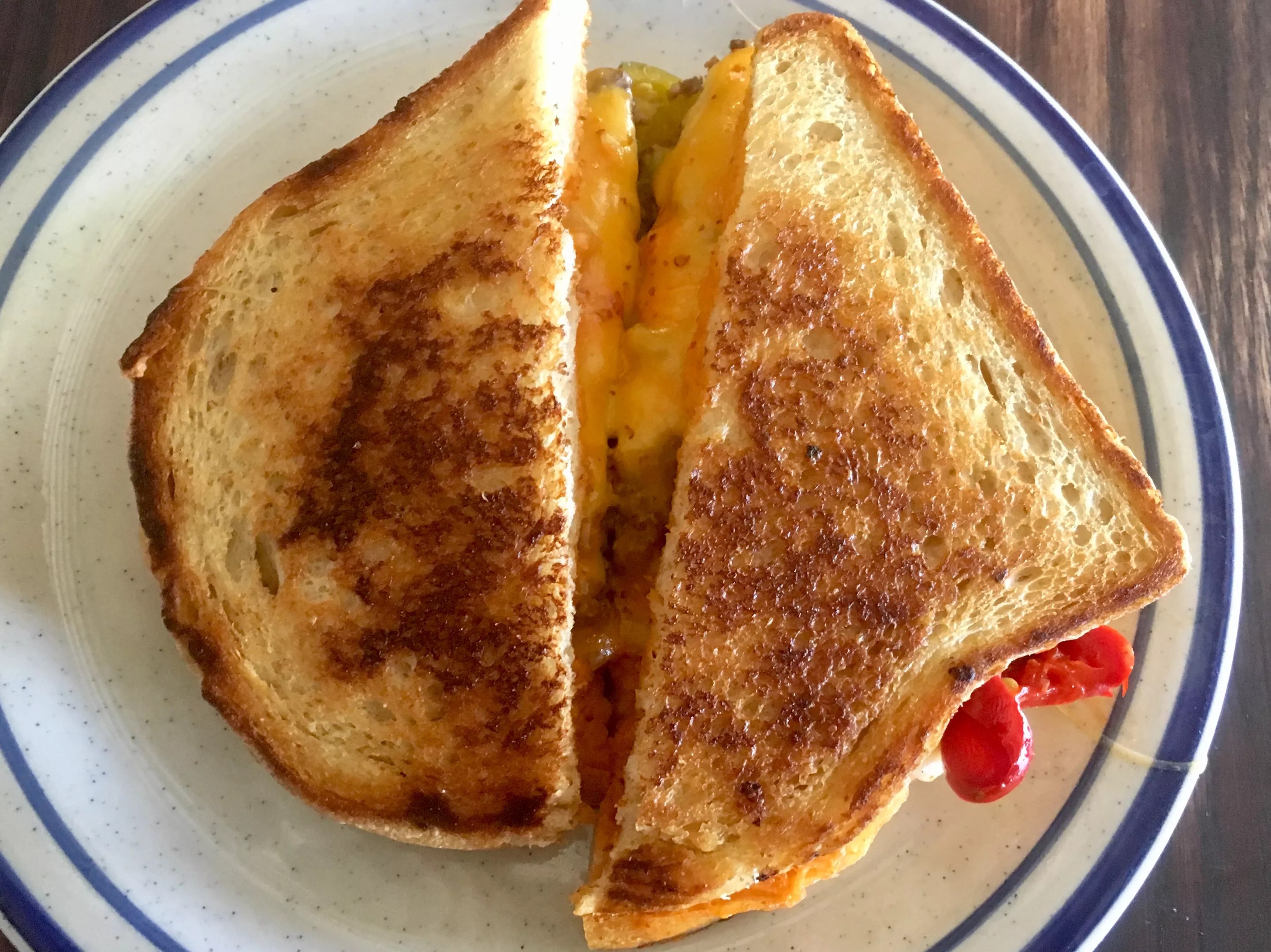 Then, the plate drops looking like it was pulled from the back of grandma’s pantry: It’s white flecked with blue and a blue rim. The only thing on the plate is the sandwich, and it’s not plated with any trumpet-announced fanfare. It’s the little diner things that keep us going.