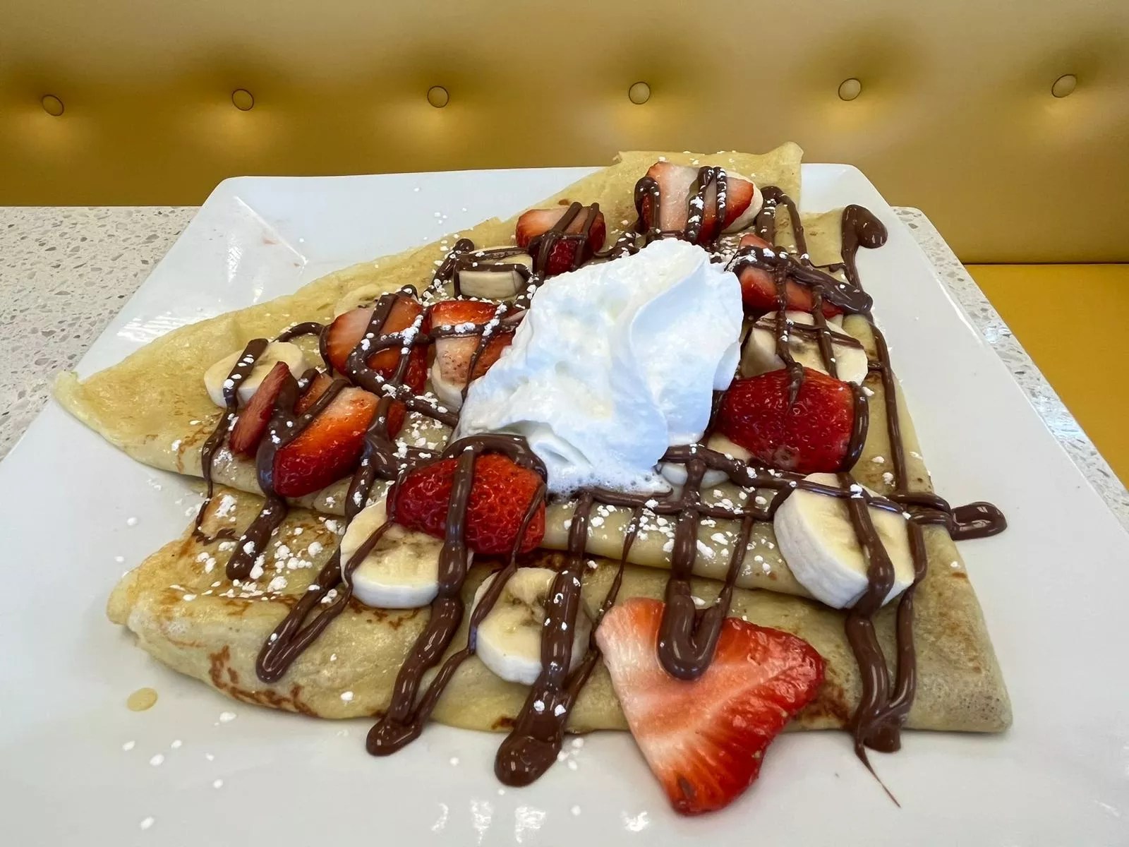 Strawberry-banana crepes come drizzled in Nutella and topped with whipped cream. They’re really big.