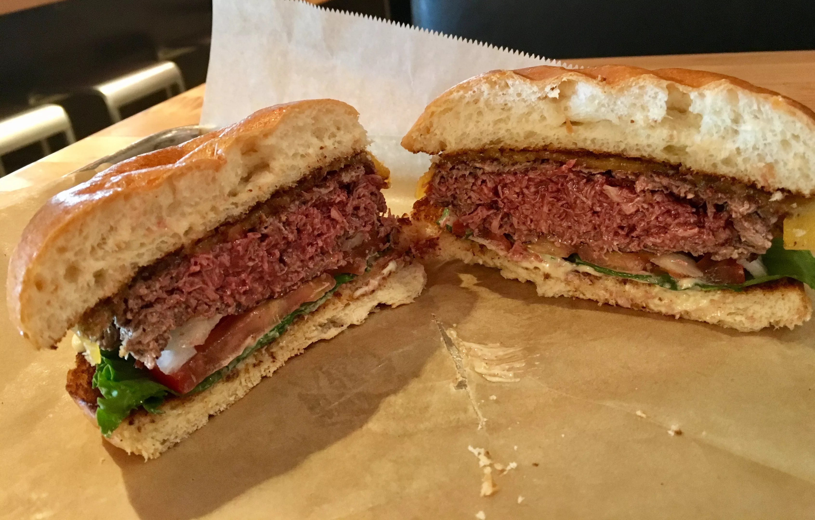 First, and this is important, the people at Hopdoddy did everything they could to make it good. They seared the Impossible Foods patty on the griddle, enough that it had a dark, crunchy crust. They cooked it to an exact “medium rare,” a blackened char gradient leading to rosy red. They constructed the sandwich well, a thick spread of mayo underneath lettuce and a fresh, crispy onion, and a half-melted and good slice of Tillamook cheddar.