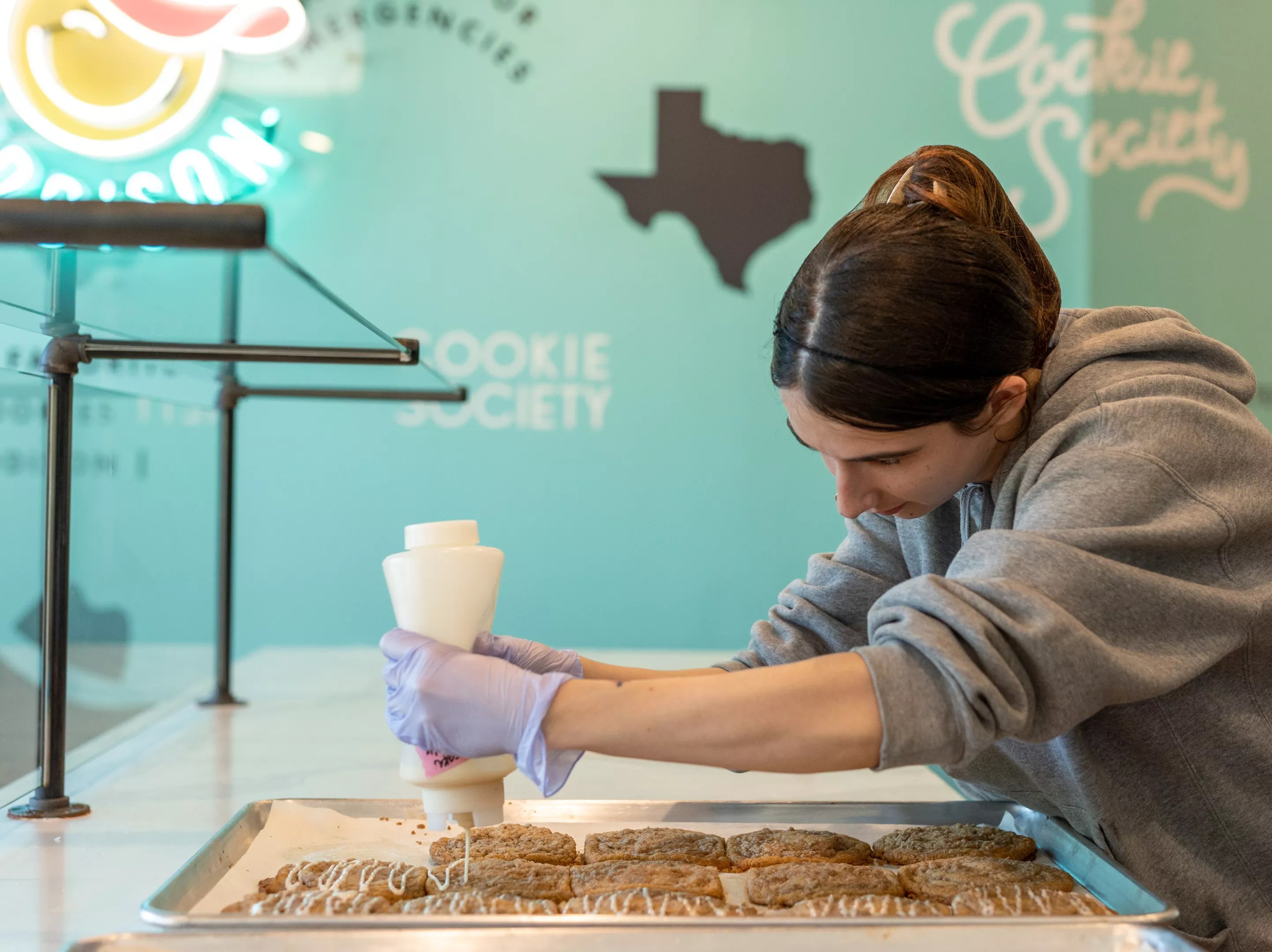 Amber Brown adds frosting to coffee cake cookies at the Addison branch of Cookie Society.
