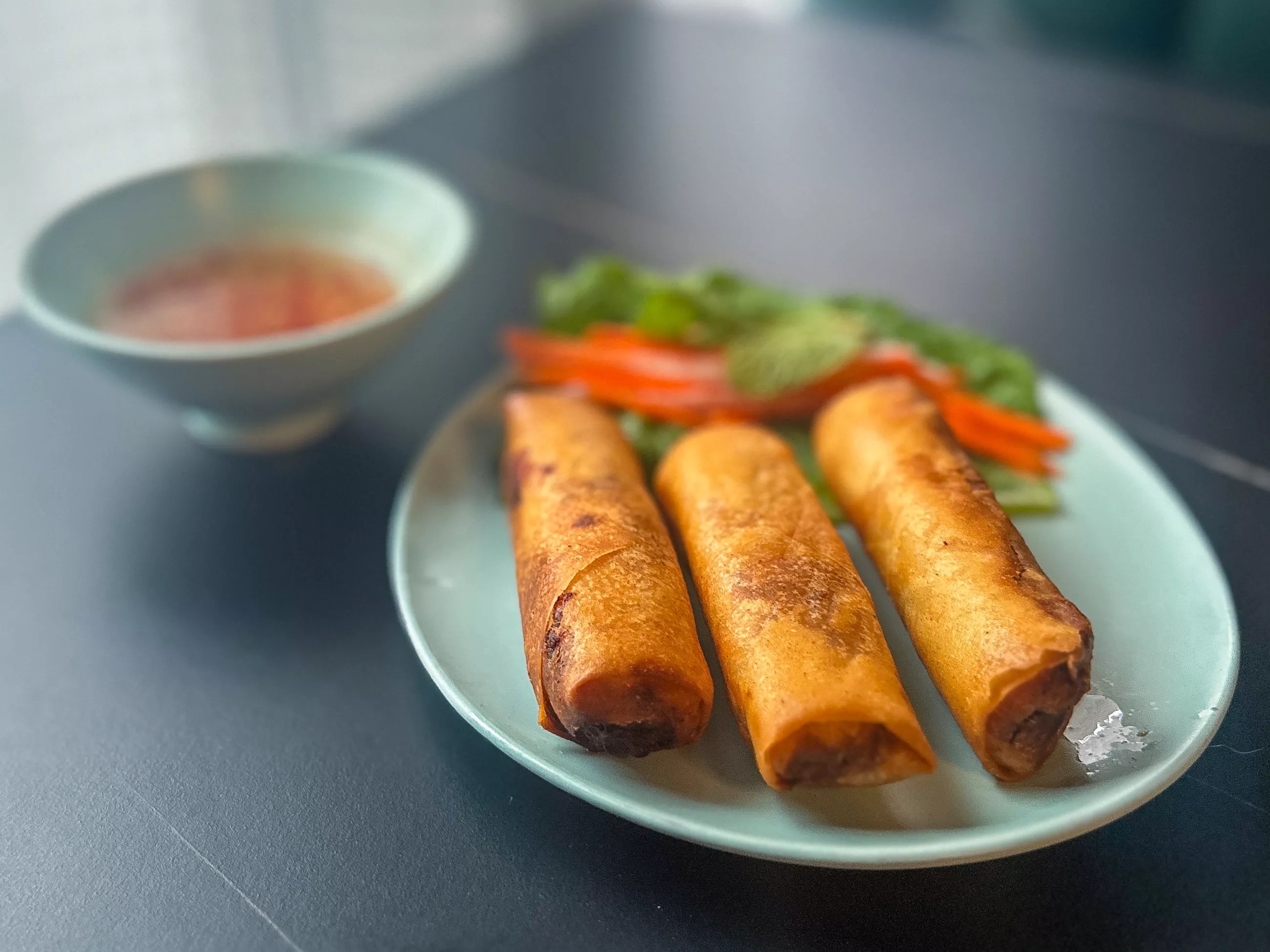 We started with a couple of cocktails, a sesame colada and a Vietnamese coffee martini, the latter because for some reason we were in the mood for an espresso martini. The sesame colada is made with lime juice and simple syrup with a sesame seed mix on top. The coffee martini is a take on traditional Vietnamese coffee complete with the requisite sweetened condensed milk. Both were fresh and brought a palatable new twist on old standards. Hot crab spring rolls (perhaps in name only). Hank Vaughn