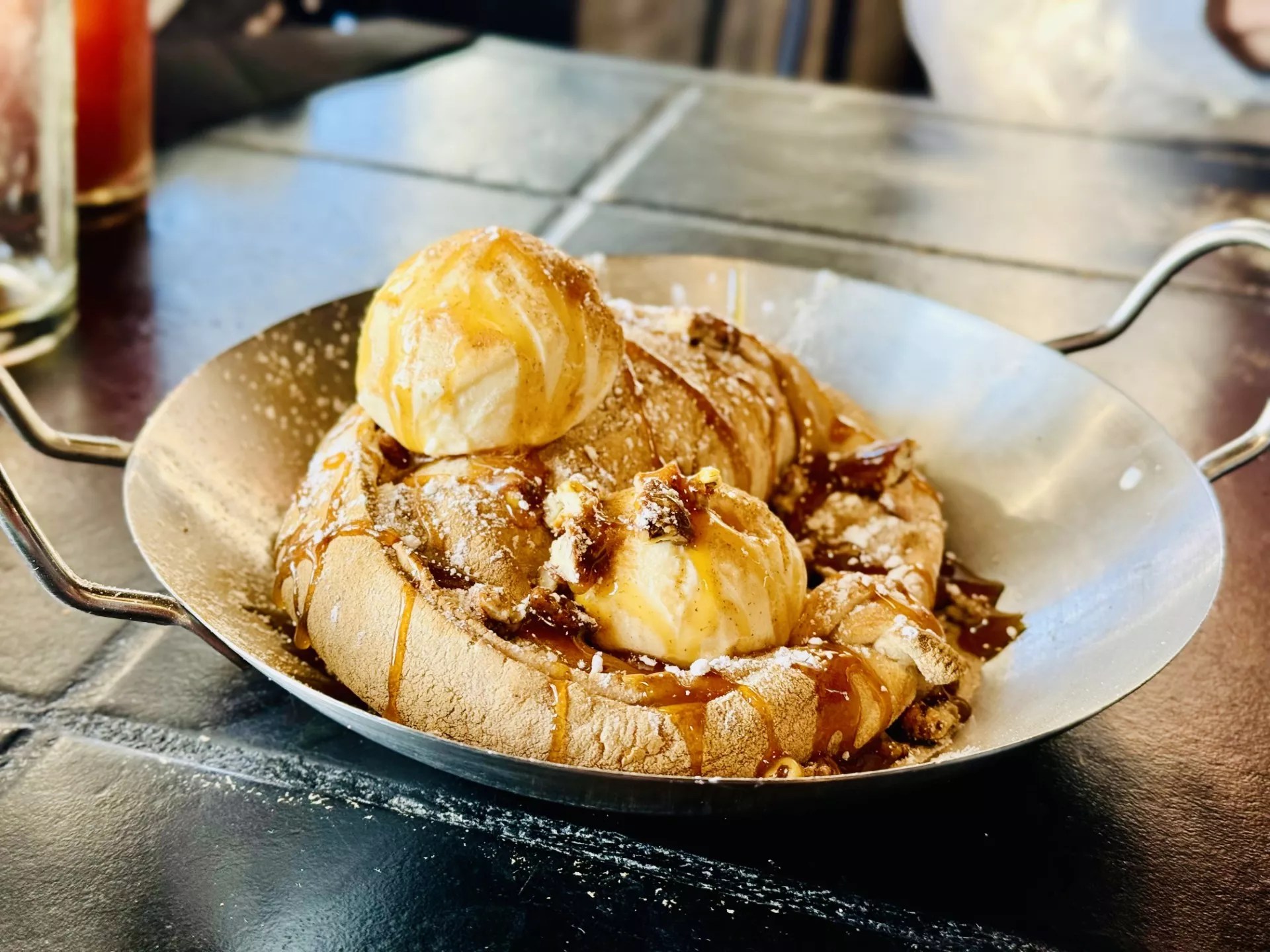 The Gizmo is a dessert calzone of candied pecans, cinnamon cream, salted caramel and ice cream.