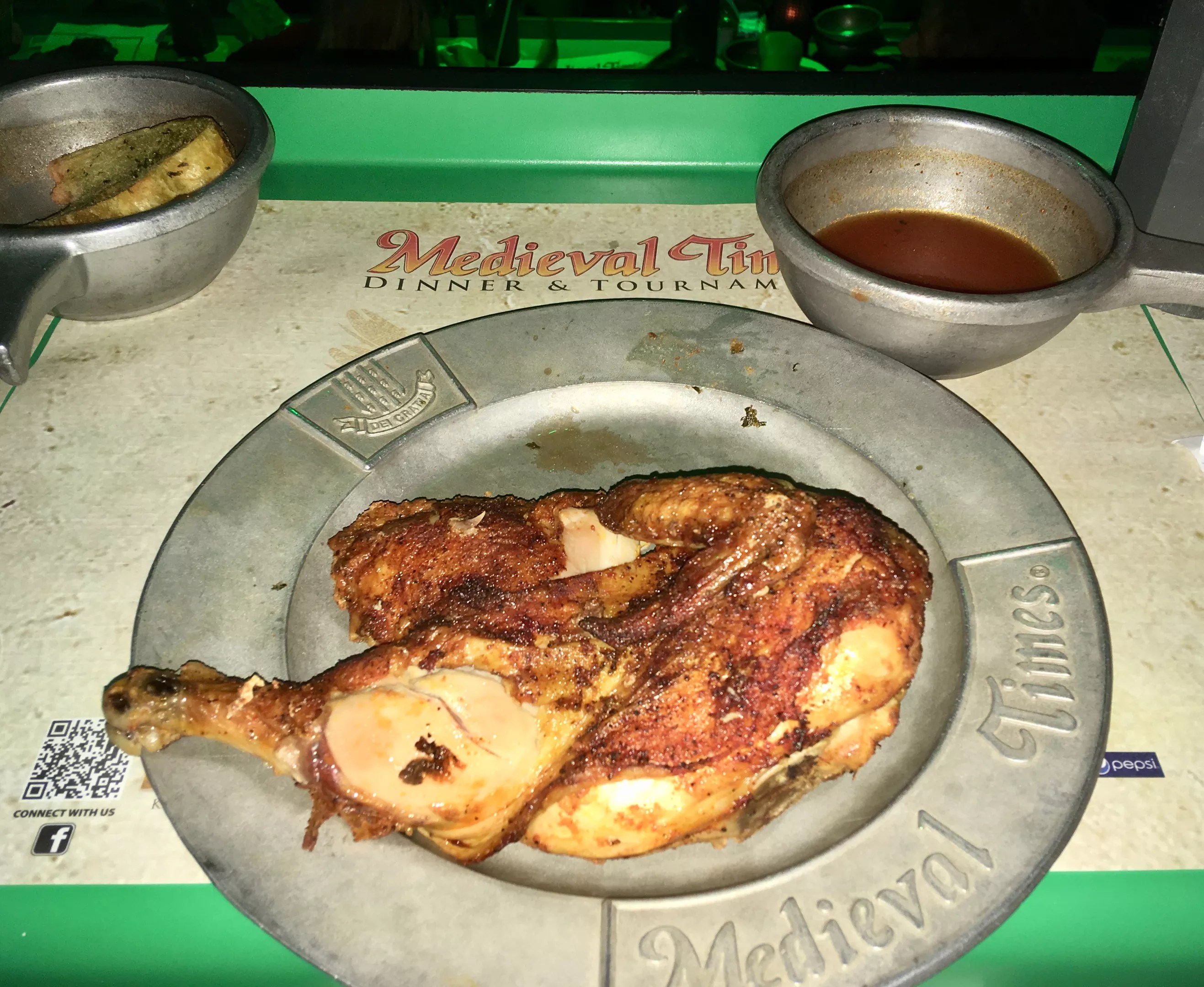 Dinner at Medieval Times is pretty straightforward – chicken for omnivores, three-bean soup and hummus for vegetarians.