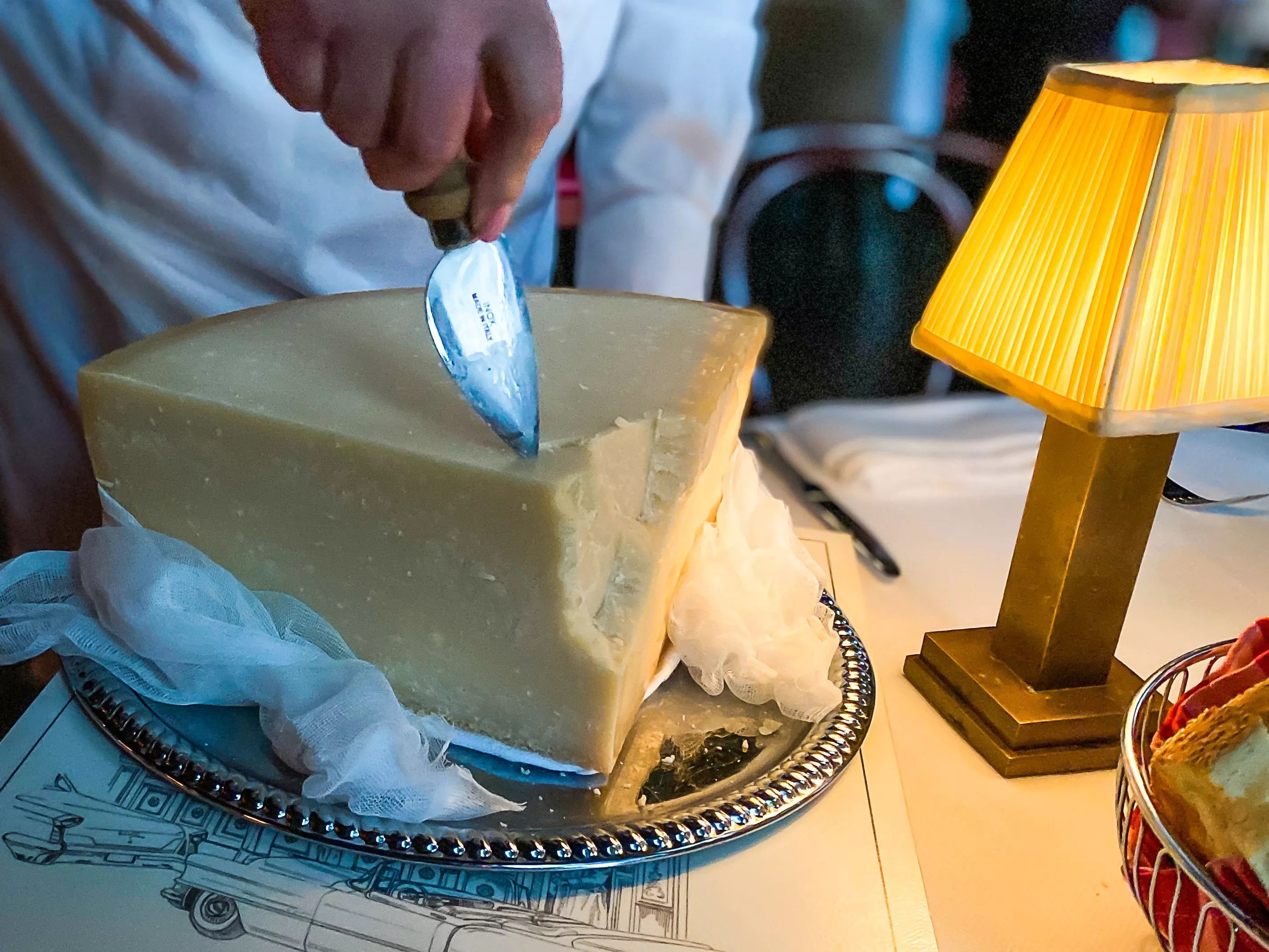 The dining room is dark, with walls of dark wood and booths tucked away in arched alcoves padded with gold fabric, all on a dark parquet floor. Diners are bathed in dim light from a couple of chandeliers as well as small individual lamps on each table. It definitely has an old-school, mid-century feel, and that’s carried over by the extensive staff of greeters, cheese slicers, water bearers, drink refillers, sommeliers, bartenders, front-of-house hangers-on and, of course, waitstaff. It was a busy hive of activity full of people out of central casting for a summer Dean Martin special, and appropriately, “That’s Amore” could be heard playing a couple of times as well.