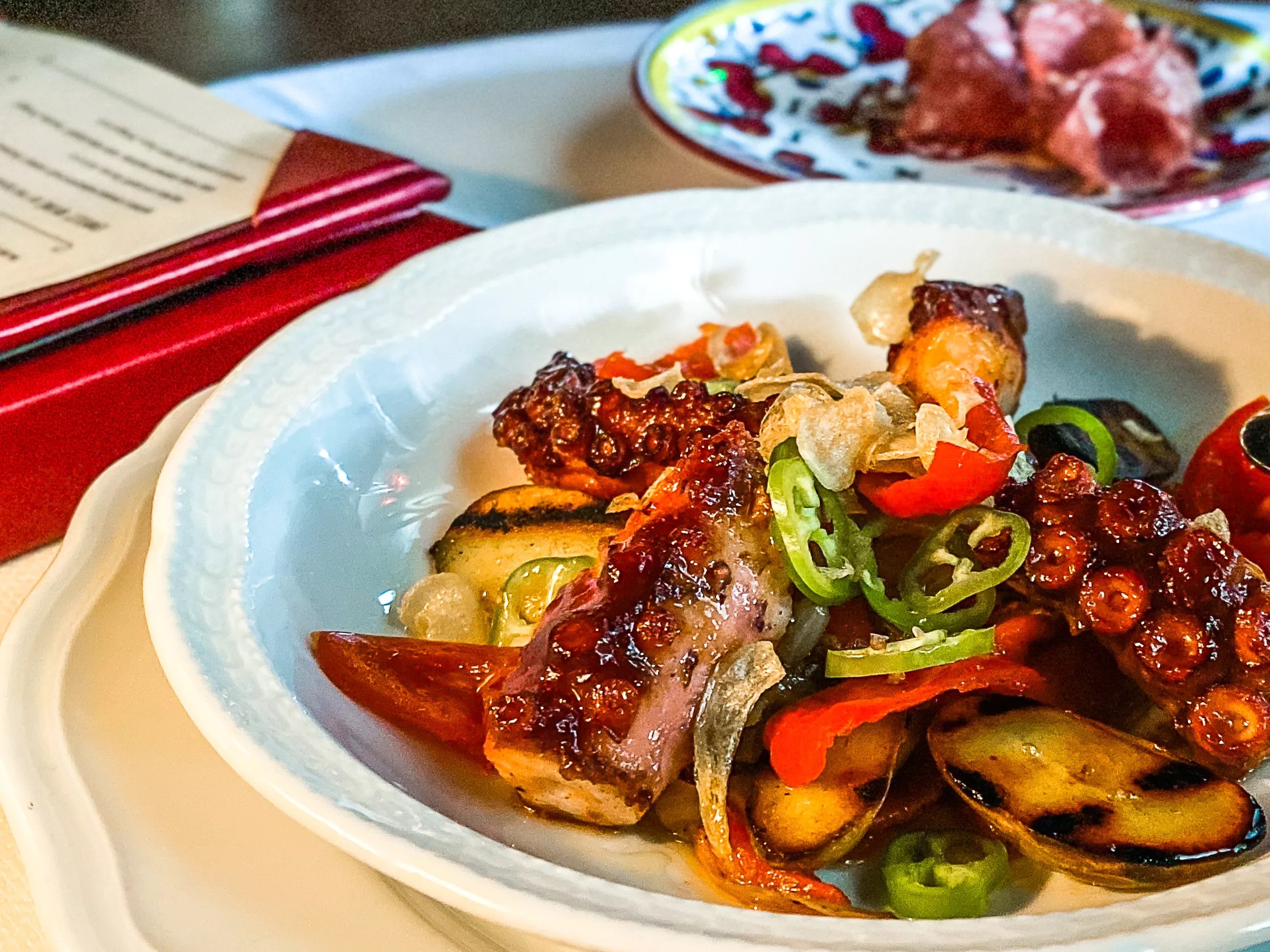 The menus are almost comical in size: a family of four could probably pitch one in lieu of a tent at a rainy campsite. They were a bit unwieldy, but again, this seems par for 1950s America, so we went with it. We each ordered a cocktail. The Old-Fashioned was a bit sweet, the Negroni and margarita average. This is where the Dallas restaurant broke with ’50s New York: the cost of each drink could probably have fed a person for a week at the local automat back then. Octopus pizzaiolo Hank Vaughn