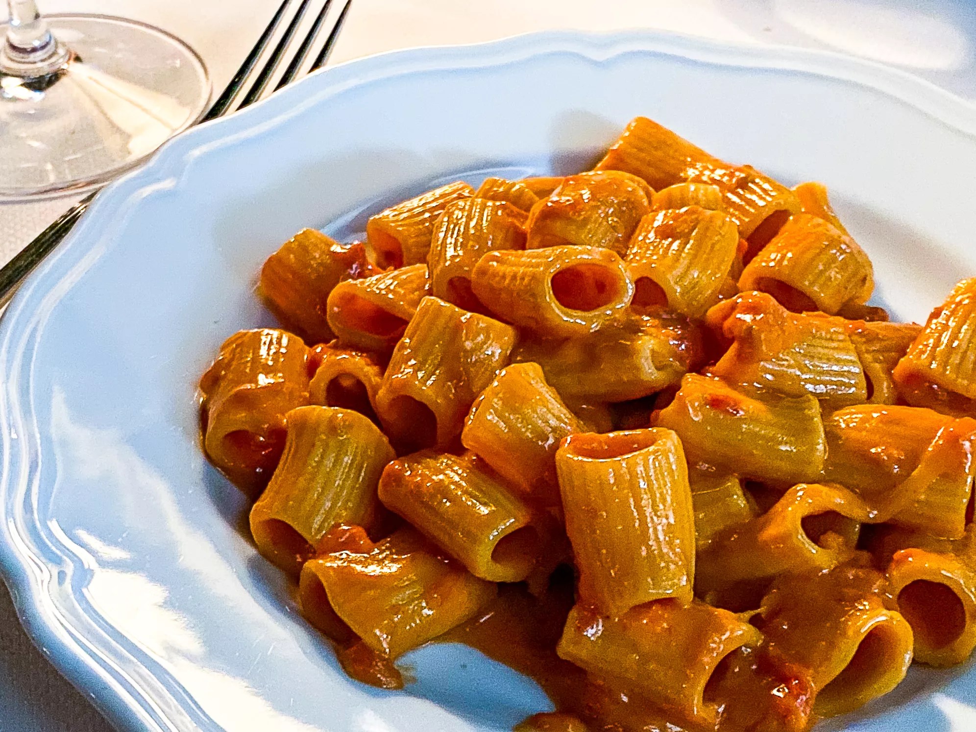 Our antipasti selections began with the eggplant and zucchini scapece. We had wanted to also try the calamari, but they were out that evening, so we went with the next-best cephalopod and chose octopus pizzaiolo for our second starter. The scapece seemed a bit muddled, but had a good flavor, consisting of slices of eggplant and zucchini with ricotta and Parmesan in an acidic sauce served at room temperature. The grilled octopus included fingerling potatoes with bell and jalapeño peppers and was garnished with garlic chips. It was tender and had a bit of a bite to it brought on by the peppers. “Spicy” rigatoni vodka Hank Vaughn