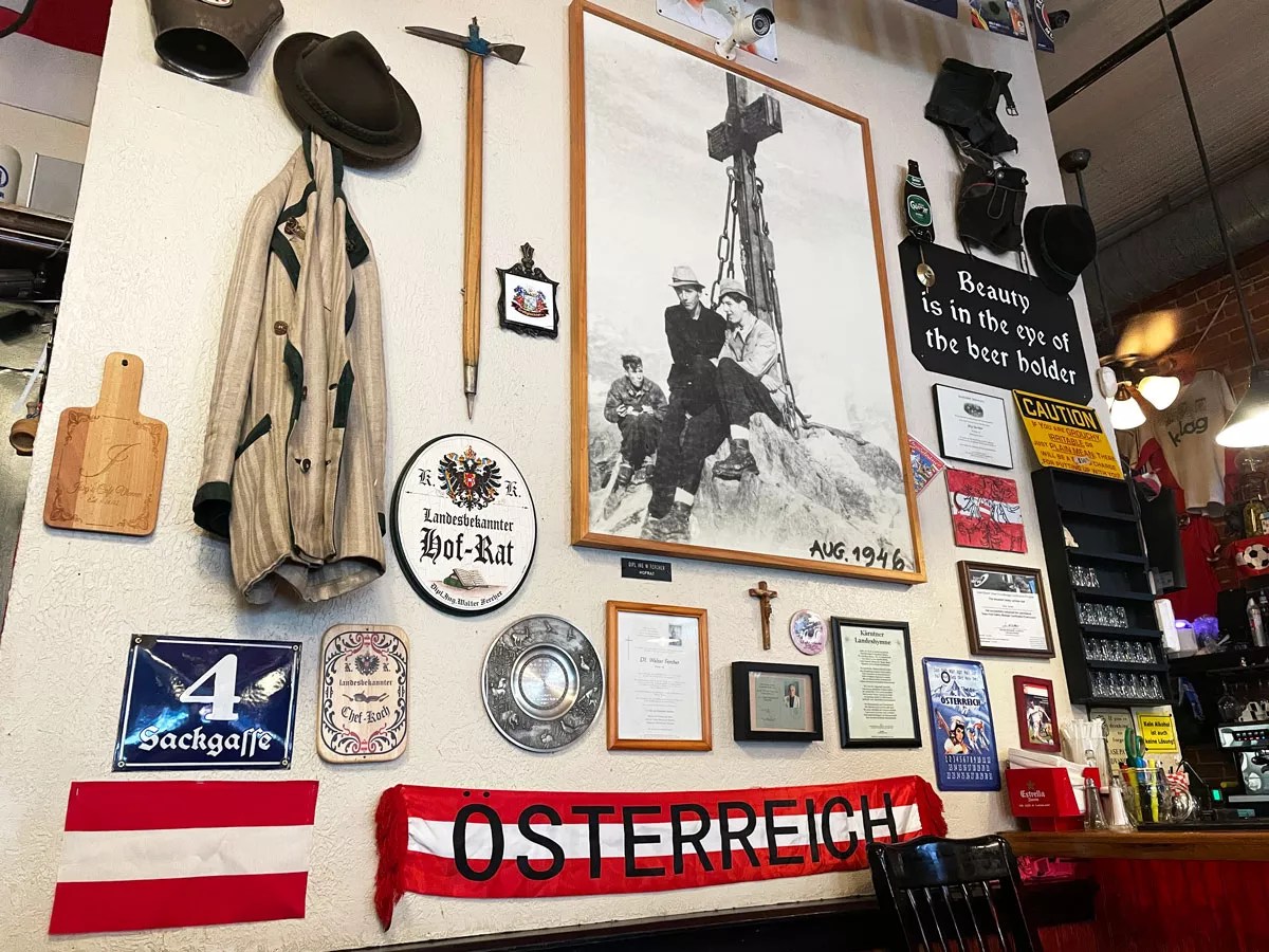 Every wall inside has a collection of eclectic, yet curated, memorabilia. Photos from the tops of jagged peaks are teeming with nostalgia, a plethora of beer posters hang around red and white Austrian flags, and old clothing and an ice ax on the main wall next to the bar allow you to ponder your life choices over your plate of schnitzel.