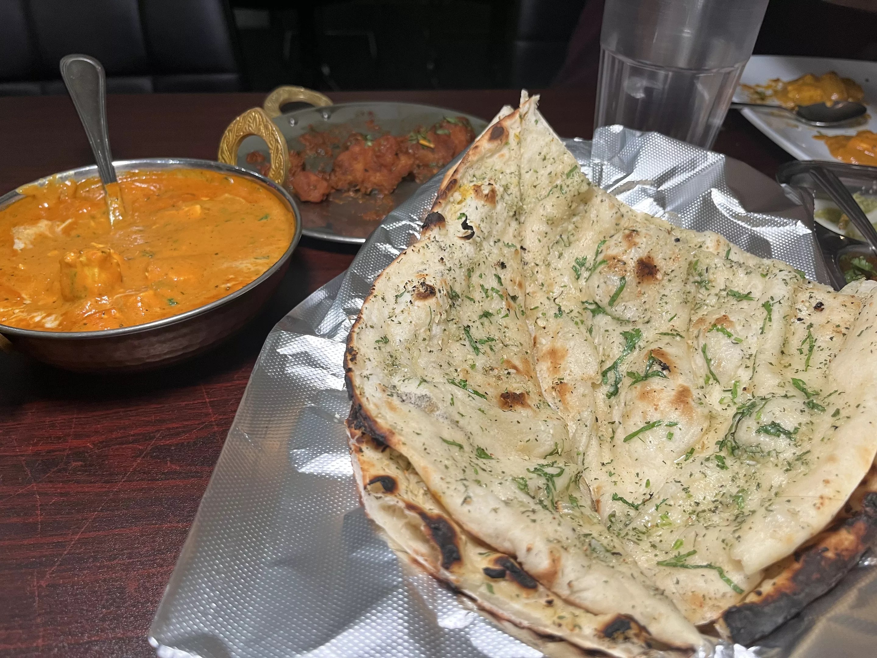 Order a fluffy piece of garlic naan to pair with over 20 different curries on the menu.