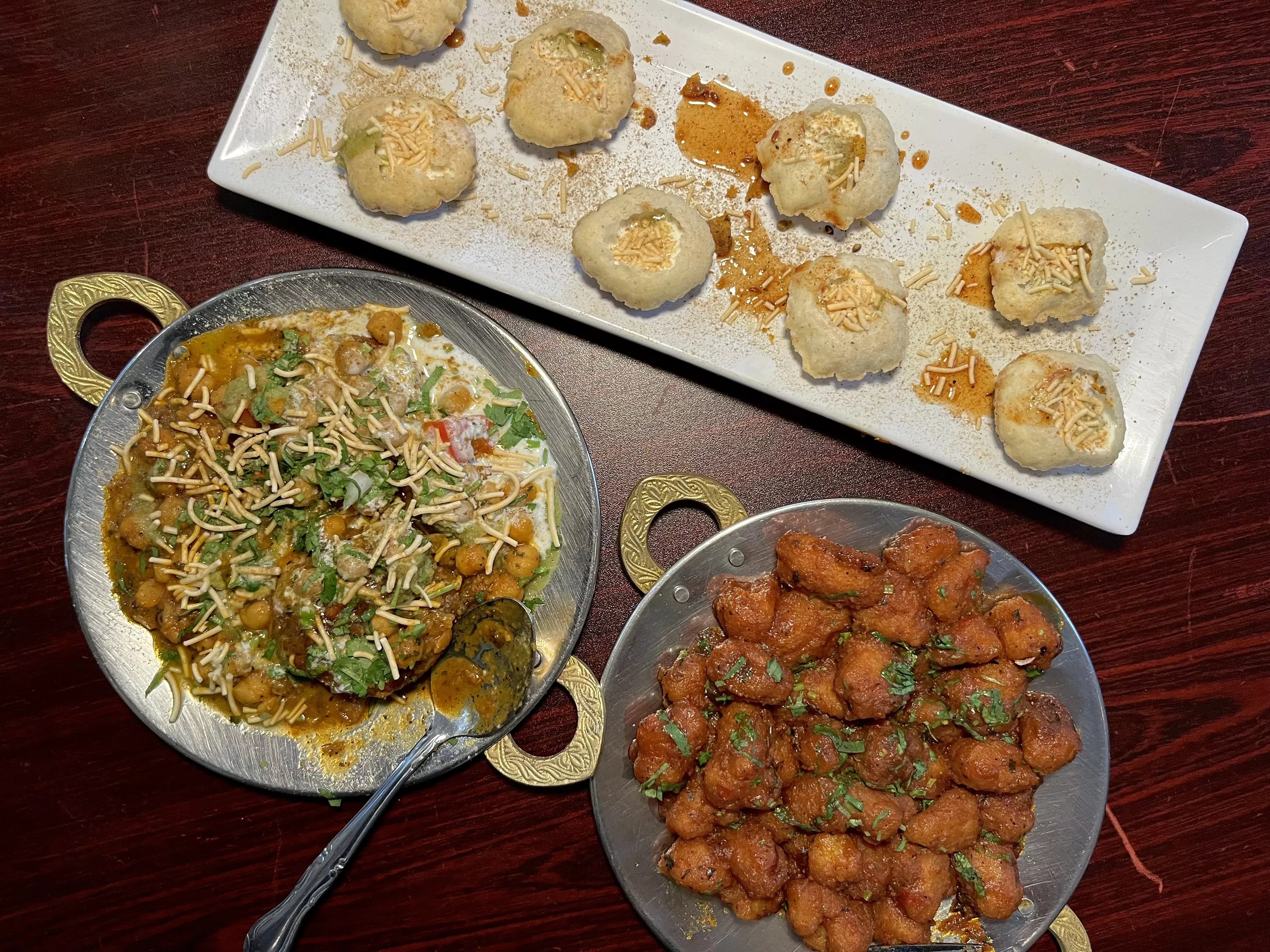 The menu here draws from the North Indian region of Punjab. Indulge in a noble spread of appetizers, which include traditional dishes like dahi puri, Indian wafers jeweled with dollops of Indian yogurt or gobi manchurian, a fried cauliflower snack tossed in sweet and spicy marinades. Both are masala-packed preludes to the aloo tikki chaat, with a lightly fried potato patty that’s crowned with a chickpea curry and sprinkles of crunchy fried potato.
