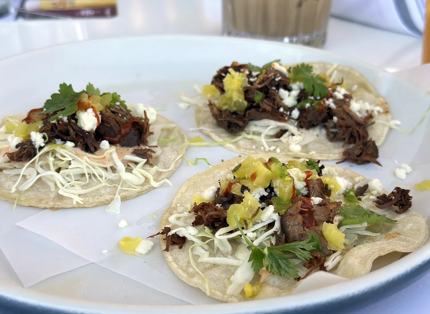 Our lunch began with a Start Me Up ($13), a boozy iced coffee. It’s an espresso martini’s sweeter sister. The Mango Bubble Tease ($7.75) is a tangy iced tea with vanilla, orgeat, lemon and popping boba. It’s a citrusy iced tea with a fun texture.